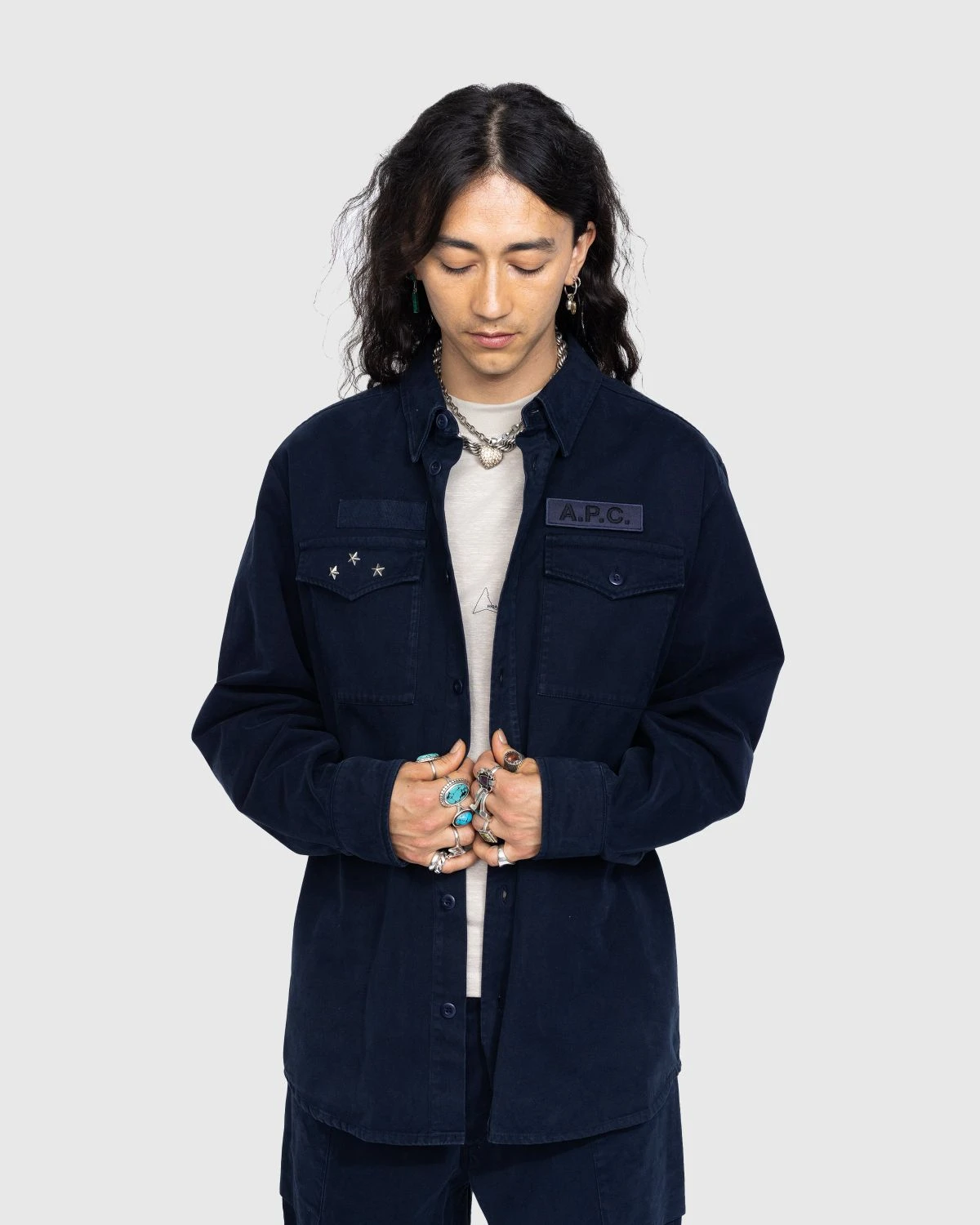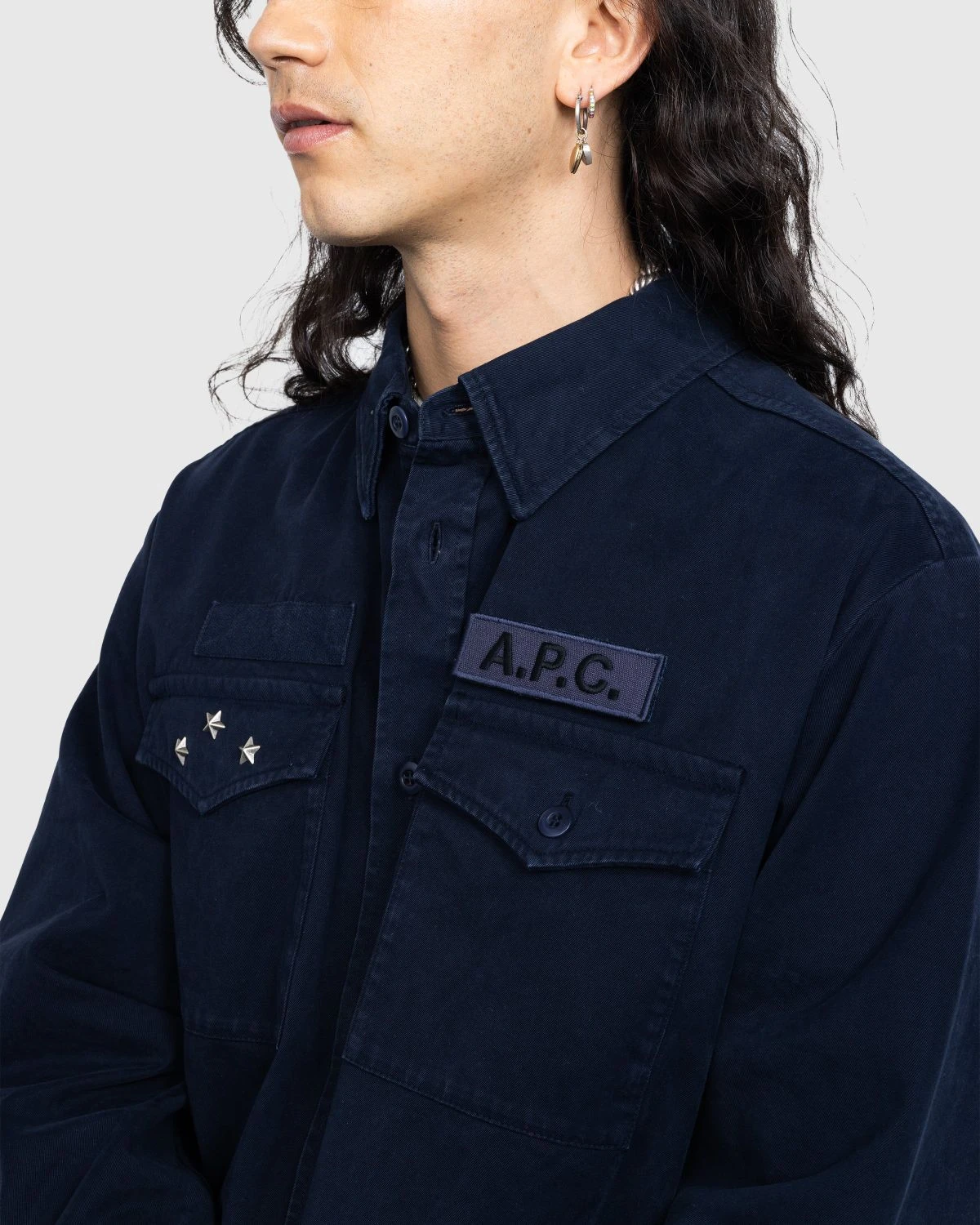 The Mainline Overshirt is created to celebrate the 35th anniversary of A.P.C., included in a commemorative collection that finds founder Jean Touitou collaborating with himself. Lost most pieces from the assortment, it is a unisex style, crafted from 100% cotton. The garment is military-inspired, featuring three metal stars on the right patch pocket and a removable touch-fastener A.P.C. patch on the left.