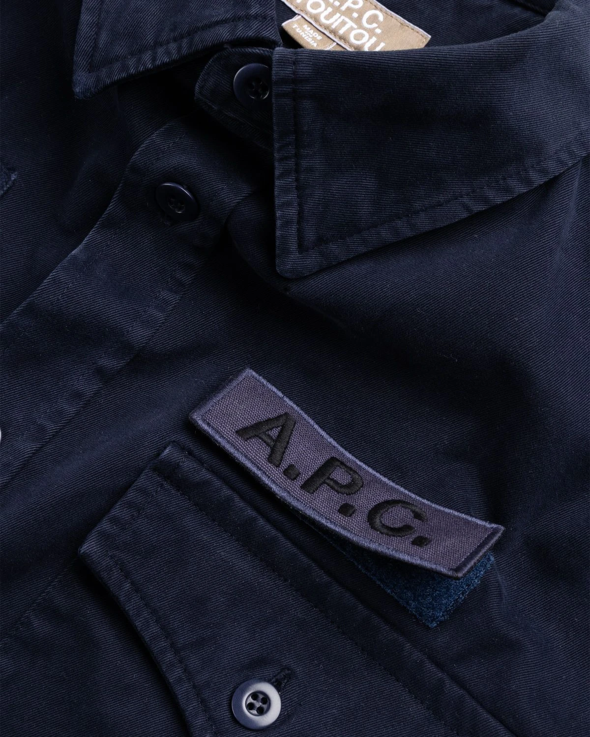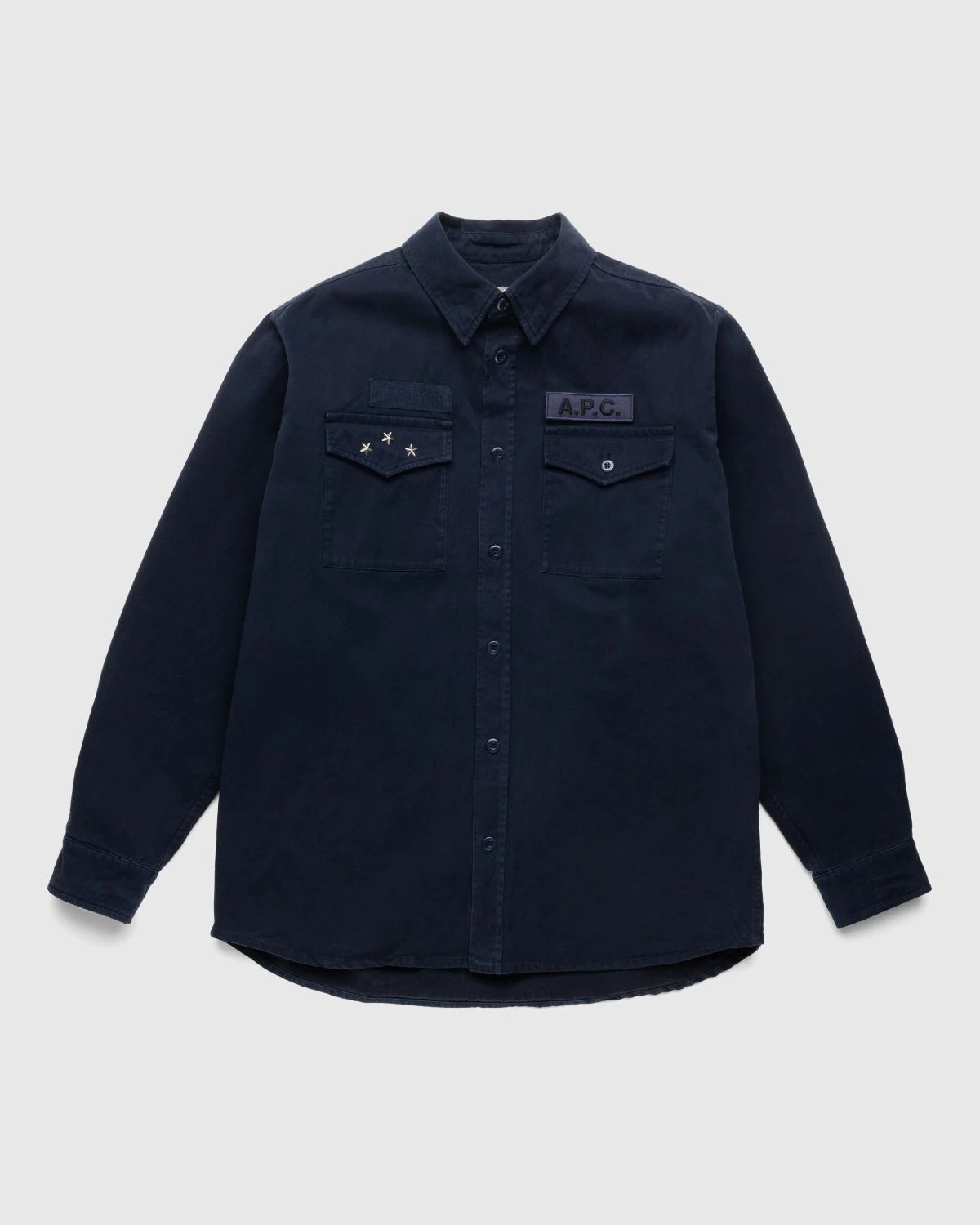 100% cotton. Button closure. Classic collar with hidden buttons. Tone on tone corozo buttons. Kick pleat in the middle of the back. Chest flap pockets, one with three metal stars and the other with a removable touch-fastener A.P.C. patch. Unisex.