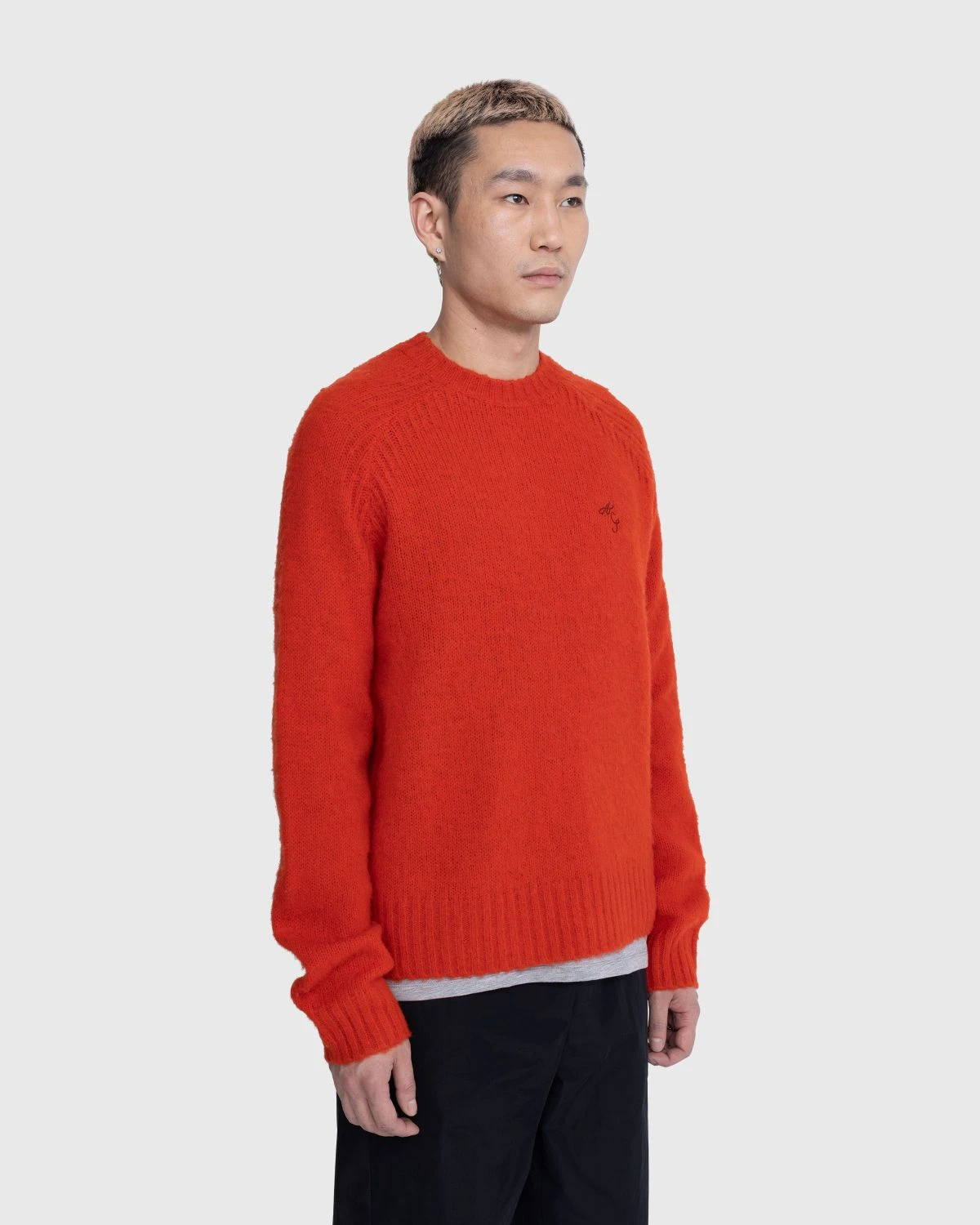 Shell is 100% wool. Brushed. Embroidery is 100% polyester. Acne Studios initials embroidery at the left chest. Ribbed crew neck, cuffs, and hem.
