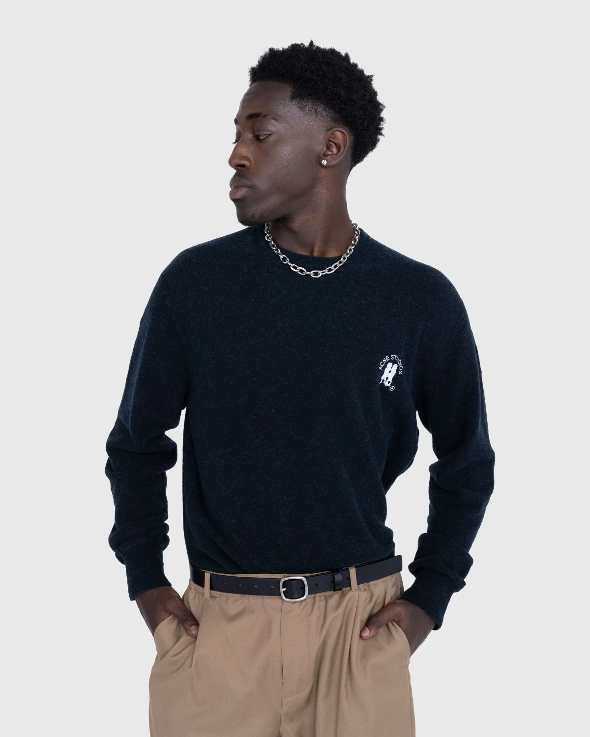 This Acne Studios crewneck is a casual style crafted from soft alpaca-wool blend, with a multi-melange color finish. Cut for a regular fit and below-the-hip length, the long-sleeve top is detailed with traditional rib-knit trims at the crew neck and cuffs while being subtly embellished with Acne Studios embroidery at the chest.