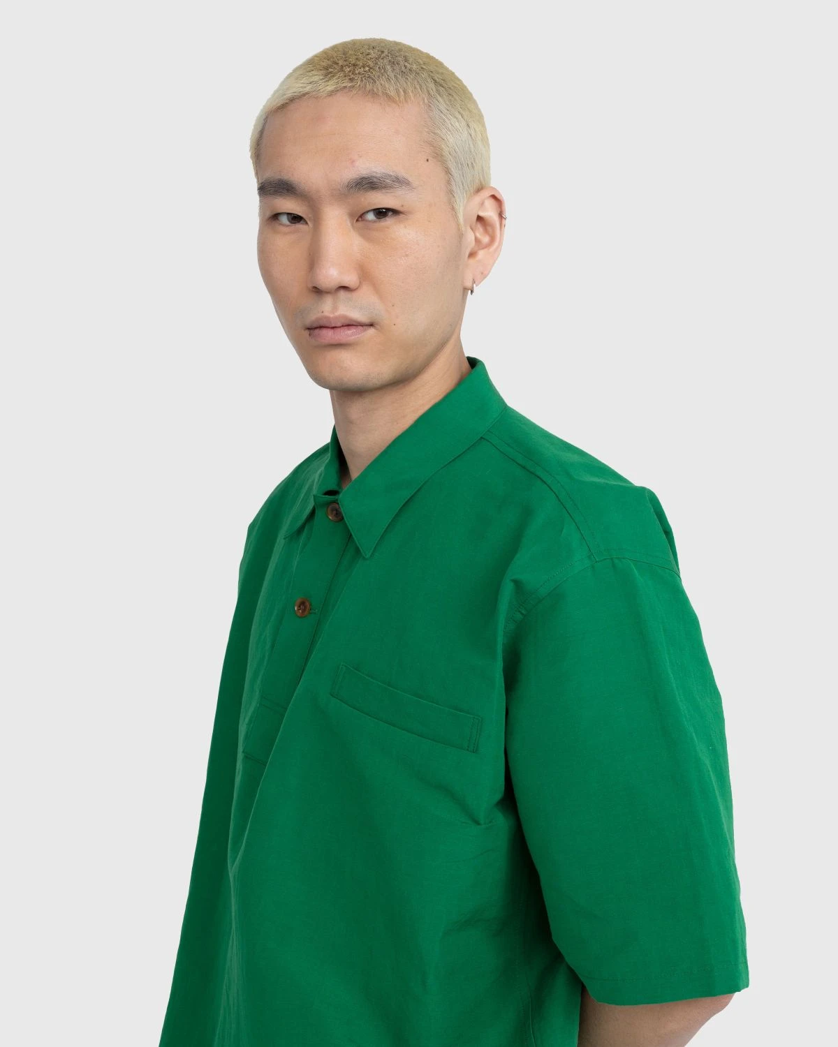 Auralee’s Finx Linen Weather Shirt is designed to bolster your warm weather wardrobe. It is crafted from a linen and cotton blend, densely woven using fine finx cotton for the warp and Belgian linen for the weft. A special wash gives the garment a natural fullness and drape, while the dyed yarn creates a deep coloring. Cut in a slightly oversized, boxy fit, the style is offered in a bold green colorway for vibrant spring and summer looks.