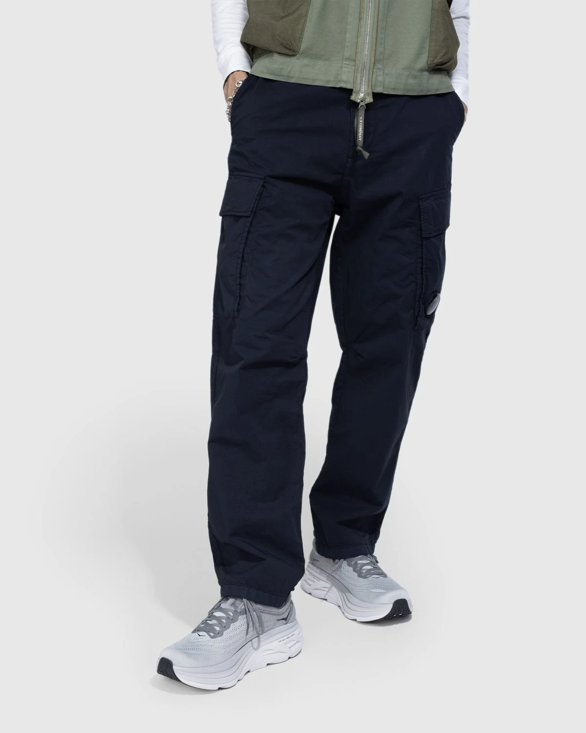 This pair of C.P. Company cargos is cut in a loose fit from a stretchy cotton fabric that is garment-dyed to create increased chromatic depth and intensity throughout. The style features reinforced belt loops, multiple pockets including slanted hand pockets, back flap pockets, and twin cargo pockets, and the brand’s signature lens detail incorporated at the left thigh.