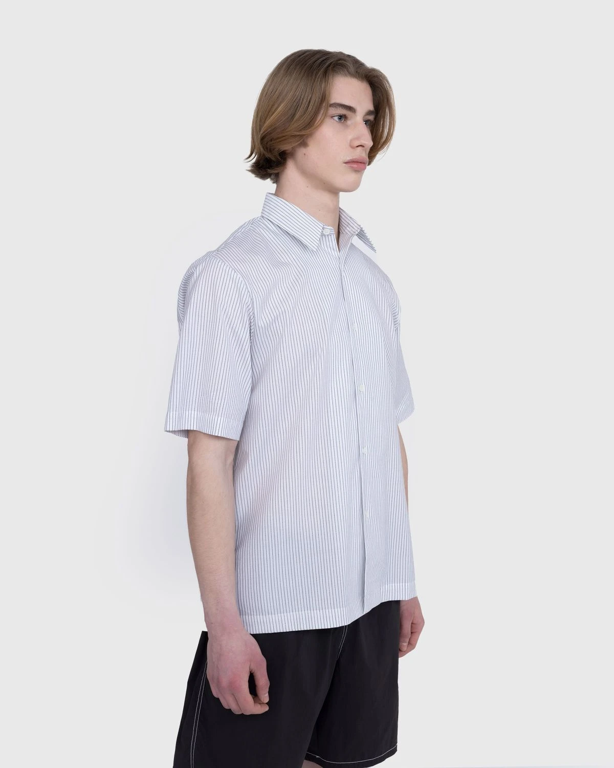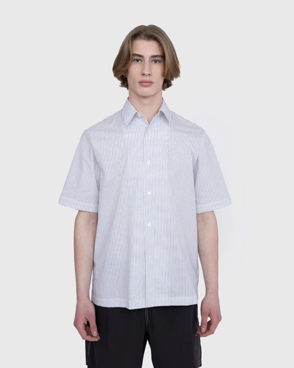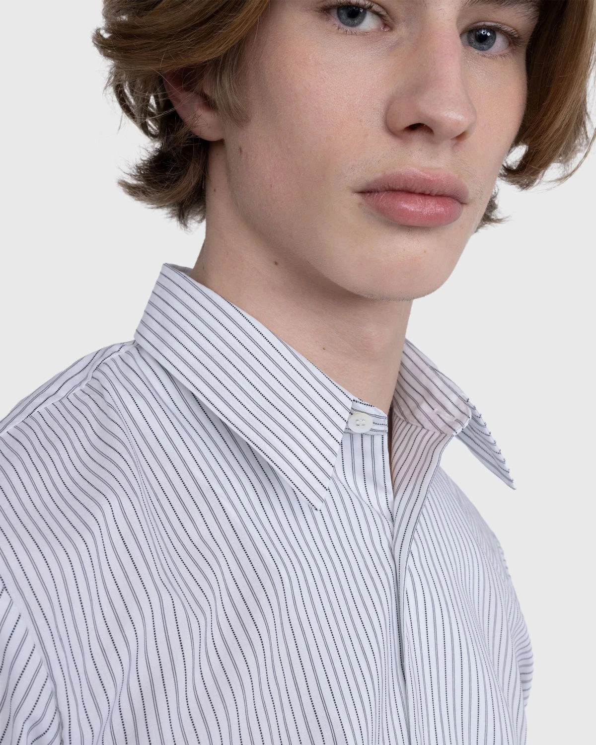 100% cotton. Pinstripe detail. Point collar. Front button closure. Straight hem.