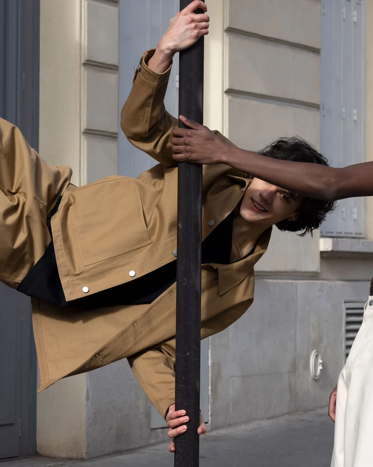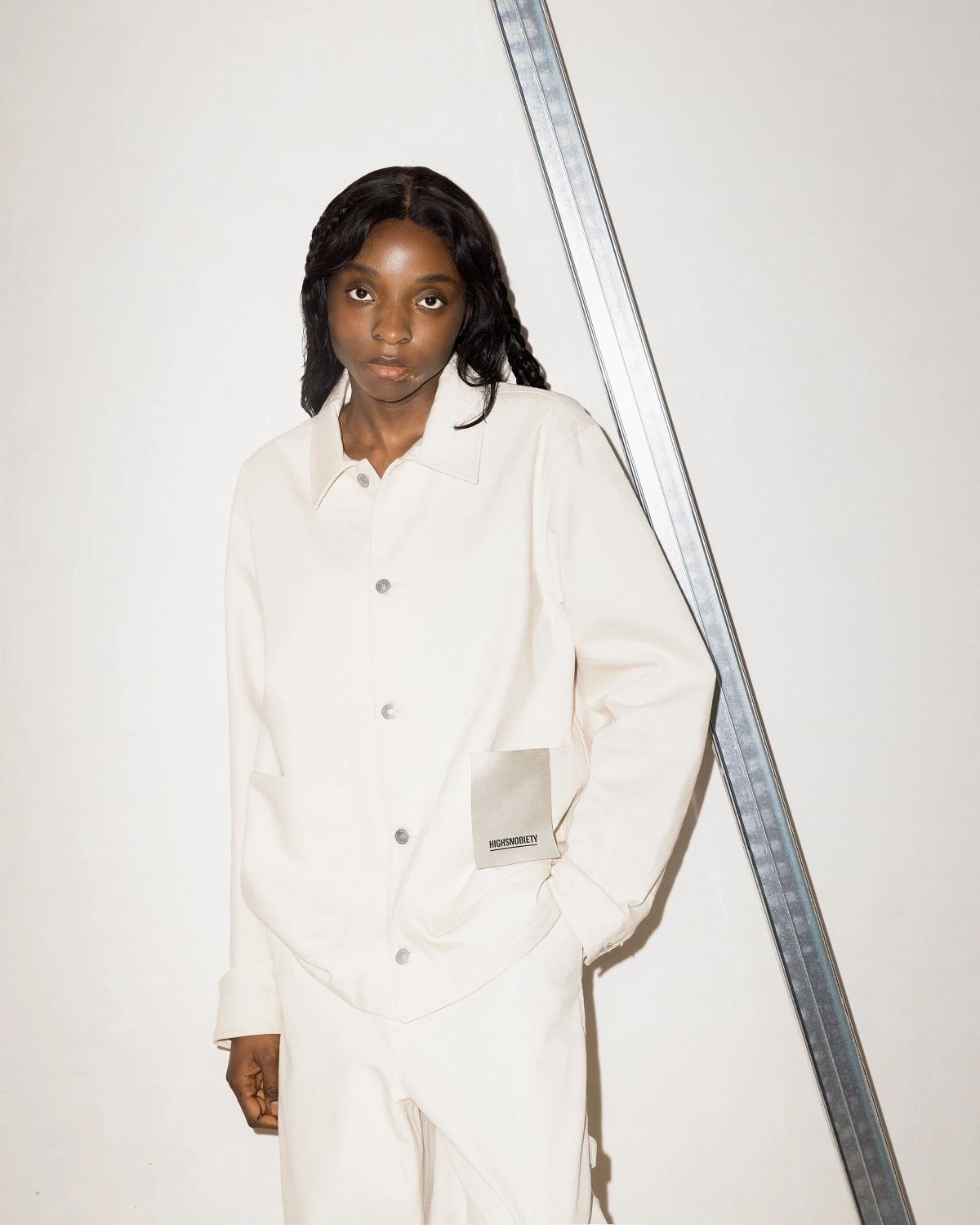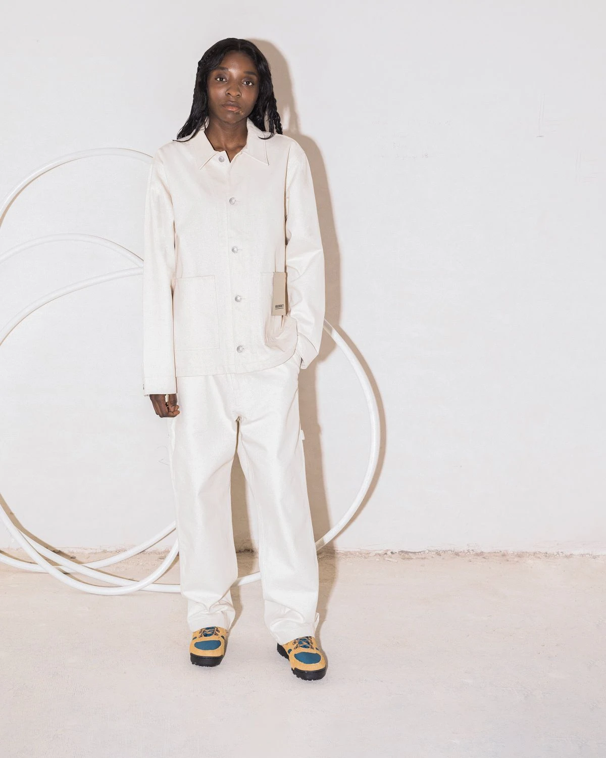 Inspired by the function-first design of workwear, this jacket is a modernized take on the classic chore jacket. Arriving in neutral colors with silver-toned, branded hardware and a boxy fit, it features two large front pockets and a flag label on the left side. The jacket is crafted from hard-wearing, organic drill cotton with matching pants also available.