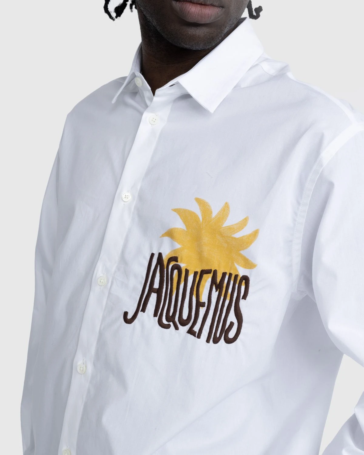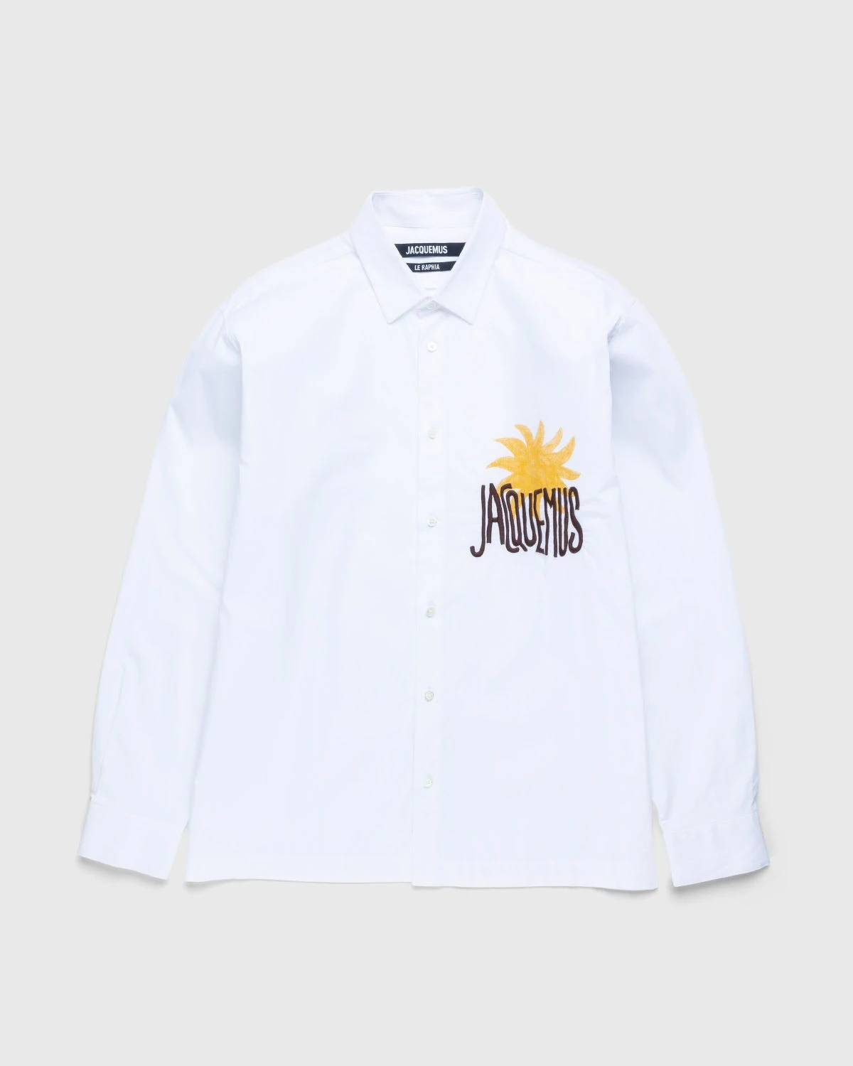 Here comes the sun courtesy of Jacquemus and La Chemise Baou. The cotton poplin button-up is decorated with a vibrant sun print and contrasting embroidery at the chest. Cut for a straight, oversized fit, the lightweight shirt features traditional front button closure and button cuffs, as it is outfitted with mother of pearl buttons.