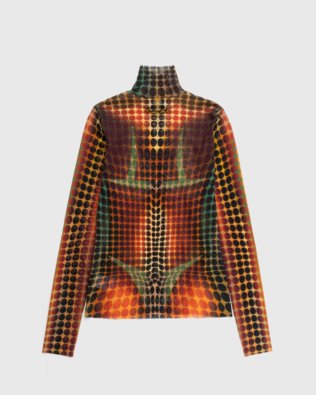 The dot print is a fixture in Jean Paul Gaultier’s retro-futuristic Cyber collection, which consists of polarizing ready-to-wear styles that point to the house’s iconic ‘90s archives. The High Neck Longsleeve is one of many pieces to showcase the pattern, coming together in a multicolor look. A tulle style, the top is made from lightweight and stretchy nylon fabric and features a turtleneck.