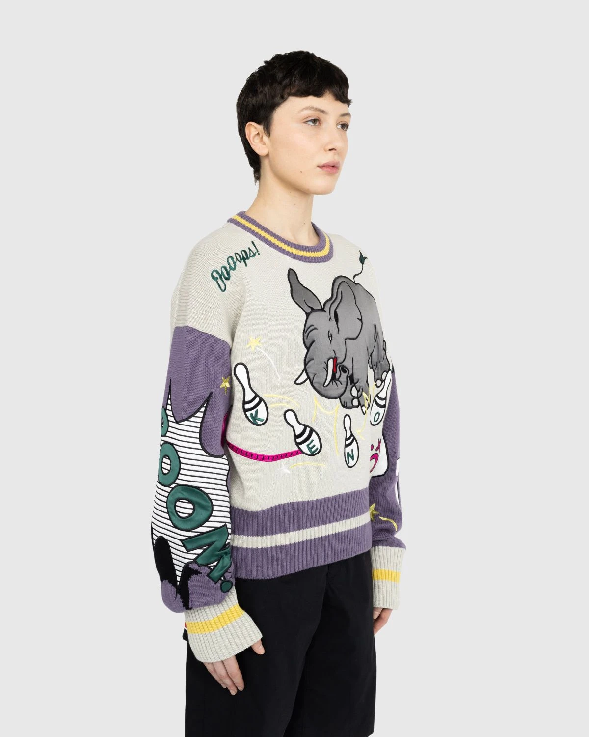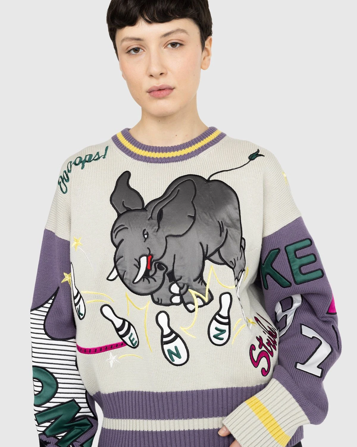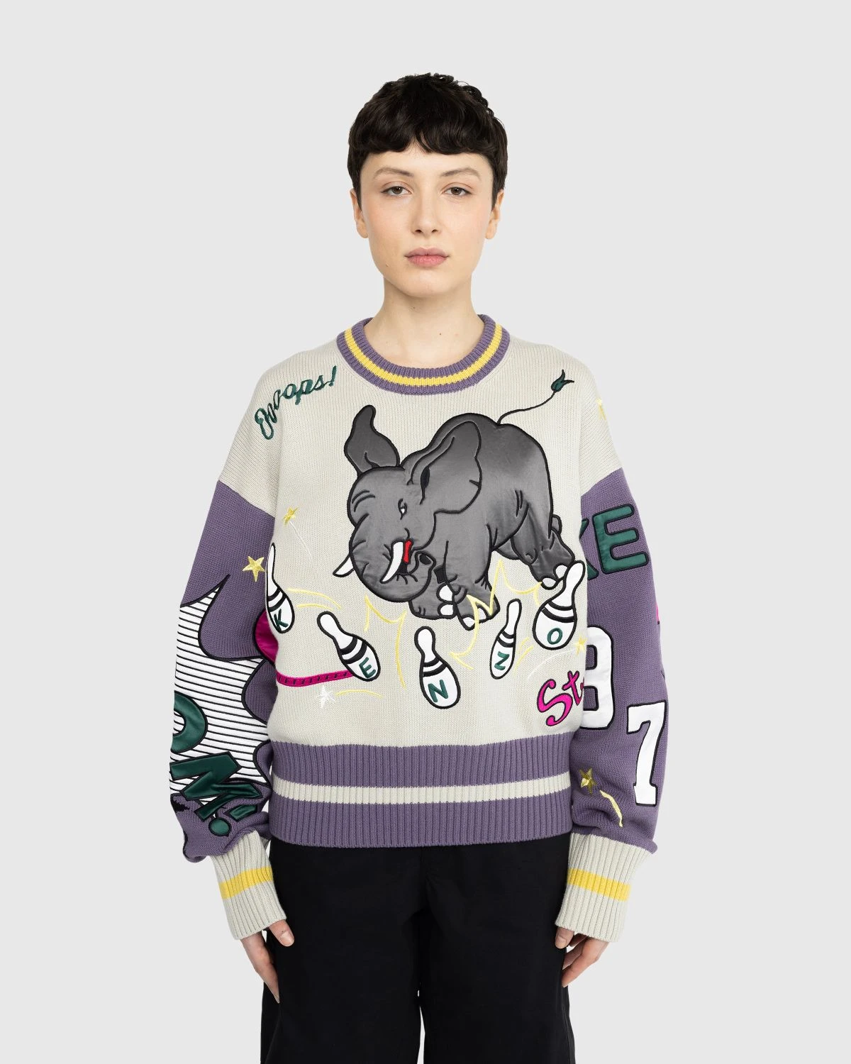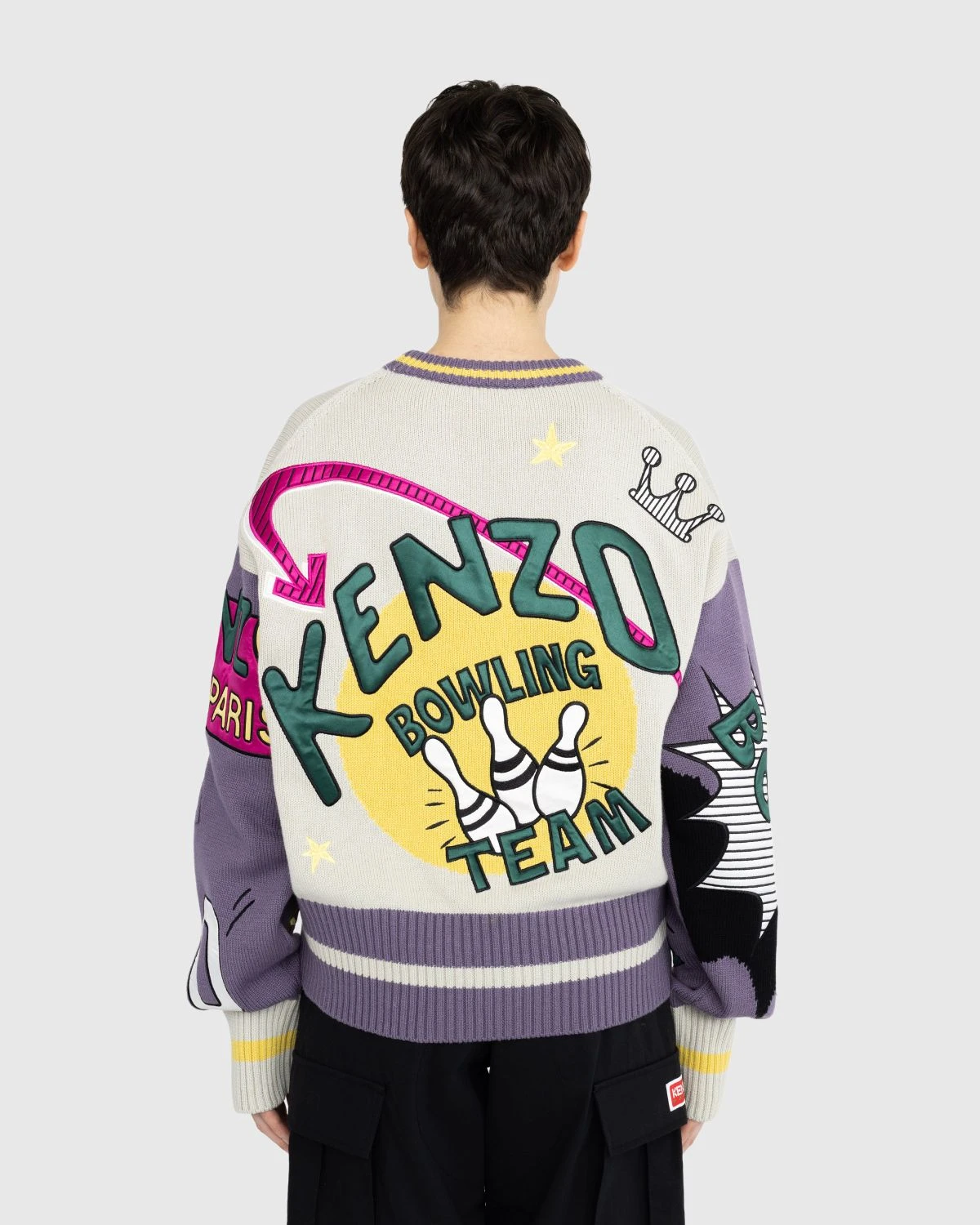 Acting as merch for KENZO’s fictional bowling team, this graphic jumper has a playful, childish quality in reference to cartoons and artistic director Nigo’s adolescence. On the front, a large elephant celebrates the brand founder KENZO Takads’s favorite animal, playfully knocking down bowling pins that spell out the brand name.