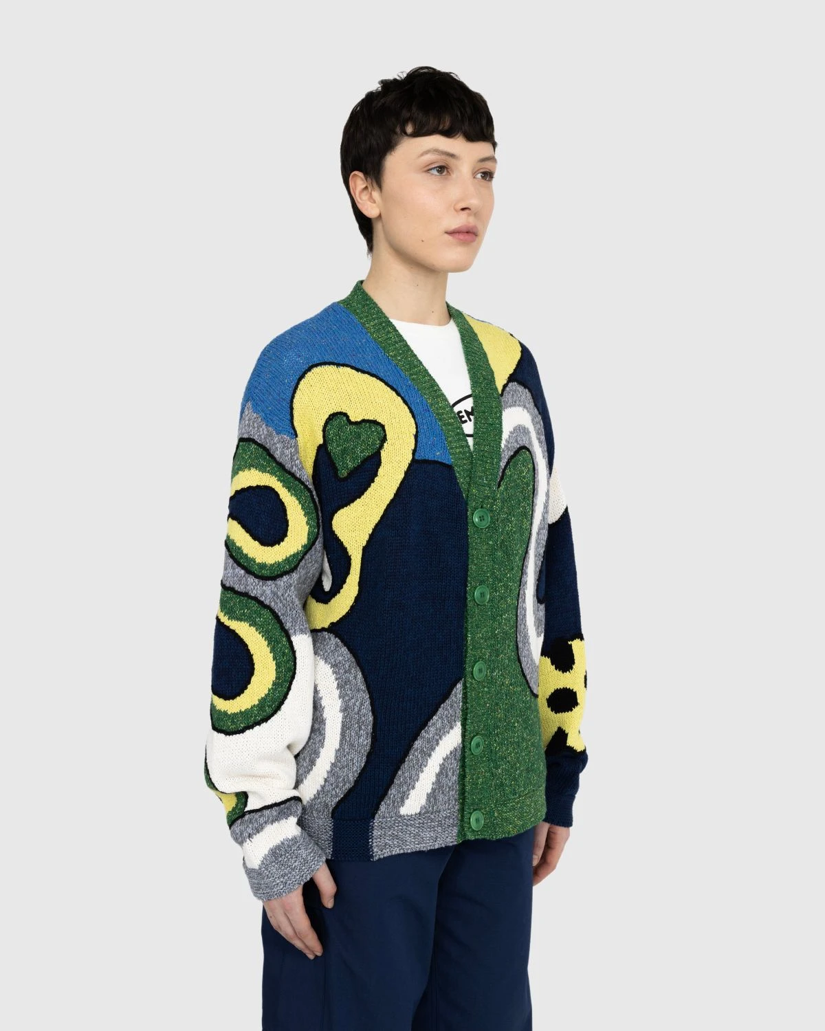 A colorful piece of knitwear to arrive from Parisian luxury house KENZO, its red, purple, and black wavy stripe pattern takes inspiration from an ‘80s print. The bold, retro-infused style is accented through black buttons, a contrasting red pocket on the left chest, and a KENZO Paris label at back. This is all offered in a boxy cut that further updates the ‘80s-inspired design.