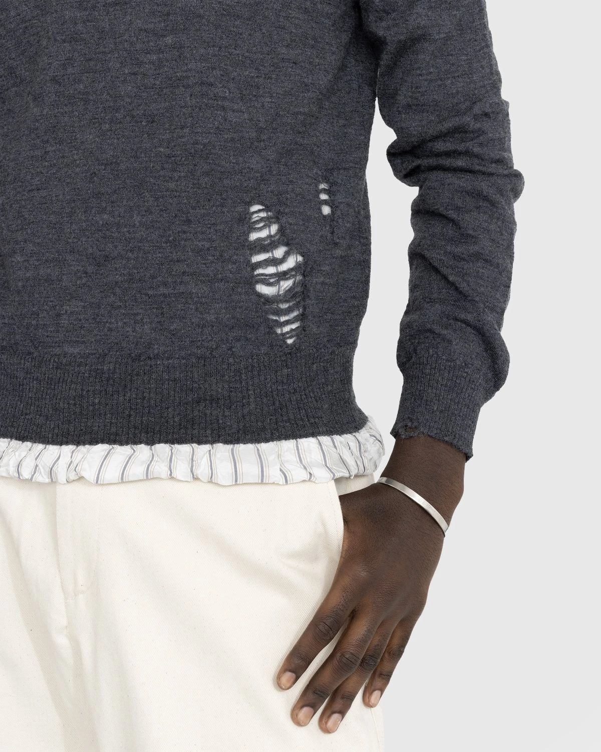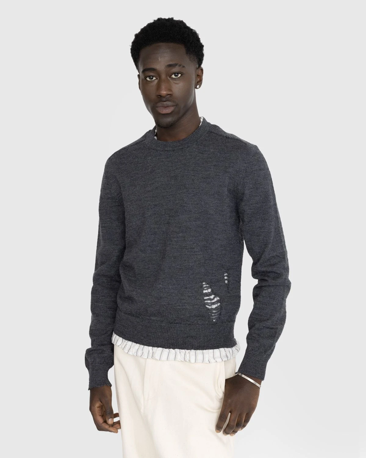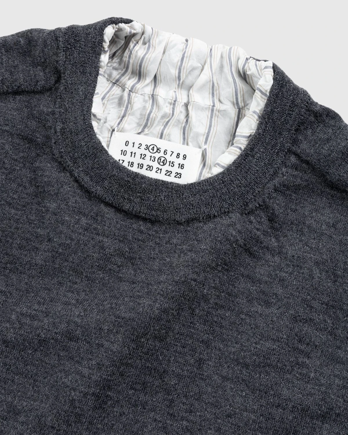 This seasonal sweater style by Maison Margiela is defined by distressed detailing that exposes the garment’s inner lining. It is produced in soft wool fabric and features traditional rib-knit trims at the crew neck, cuffs, and hem. The Maison’s signature four stitches moniker is applied to the back of the silhouette to subtly brand the style.