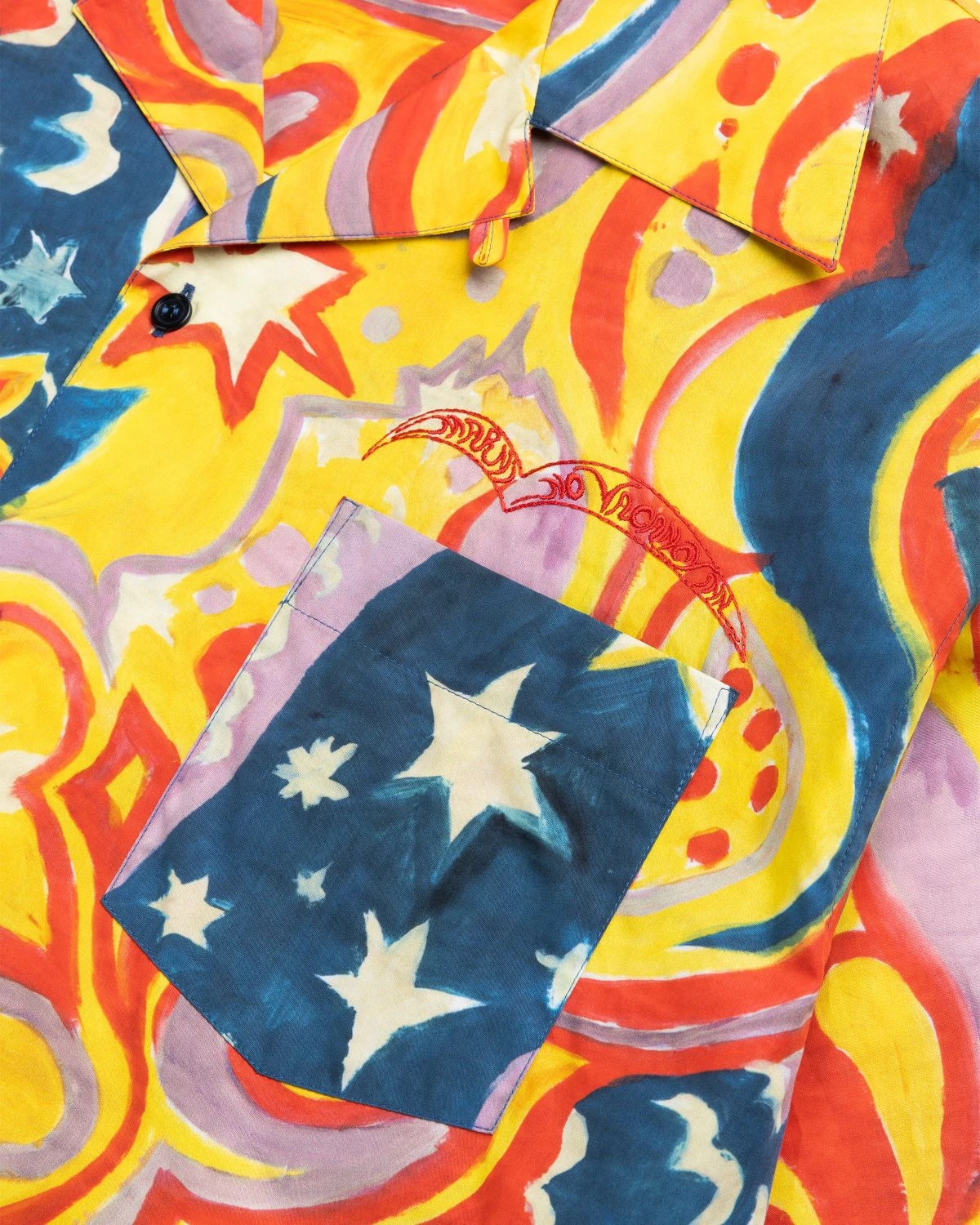 Primary fabric is 100% cotton. Woven. All-over print. Spread collar. Button closure. Left chest pocket. Marni and No Vacancy Inn logos embroidered at the left chest.