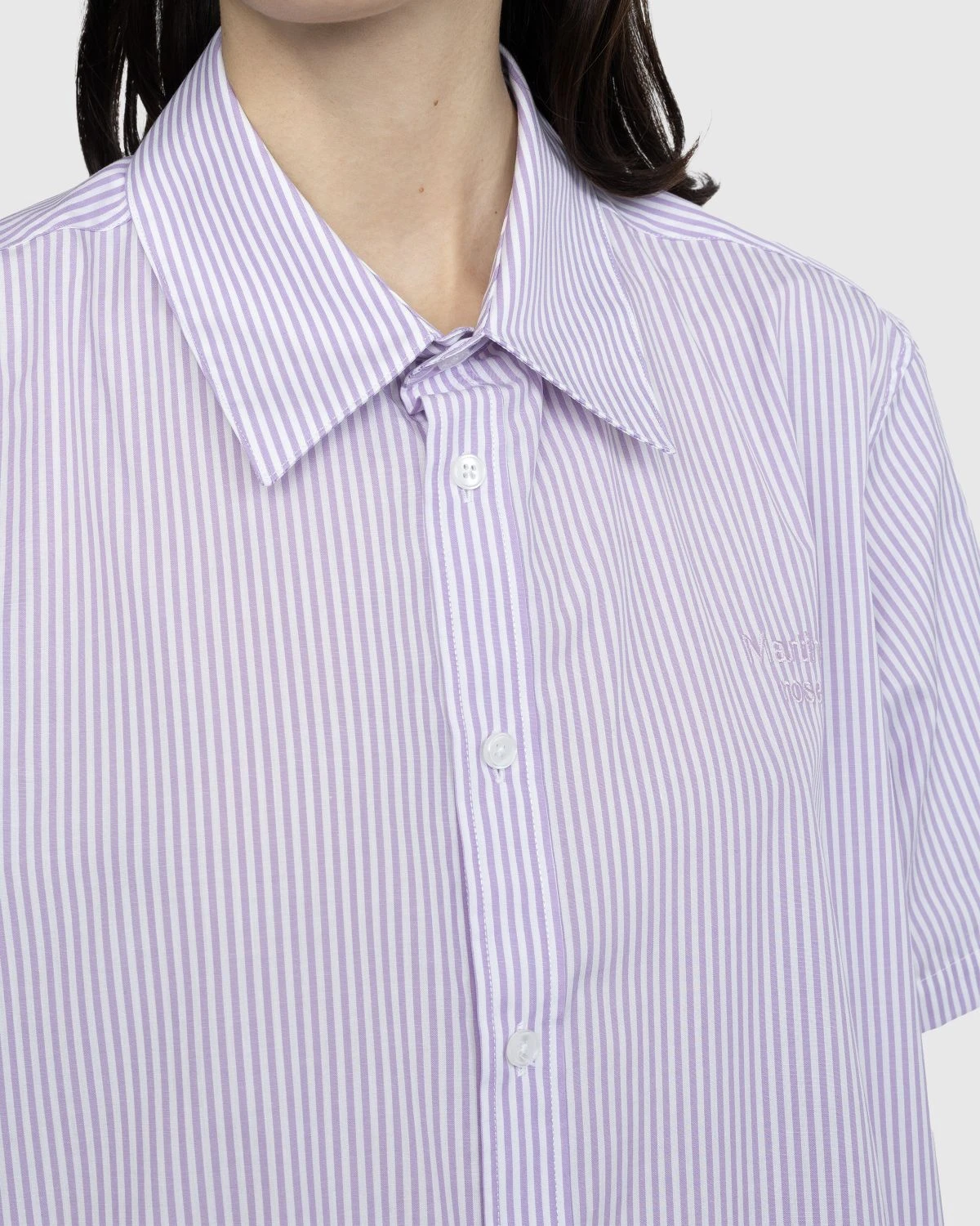 100% cotton. All-over stripe motif. Fold down collar. Button closure. Embroidered logo at the left chest. Branded tab at the hem.