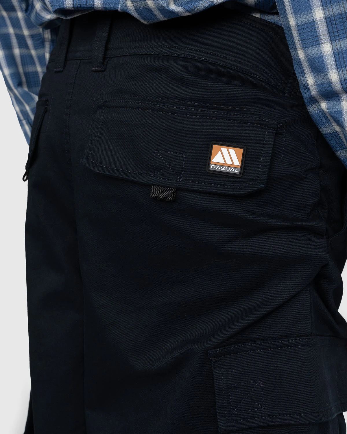 97% cotton. 3% elastane. Button closure. Zip fly. Belt loops. Tightened crotch area creates a pulled effect around the zip. Drawstring at the ankles. Side hand pockets. Two back flap pockets. Four cargo pockets. Seasonal branded tabs. Logo detail at the left leg.