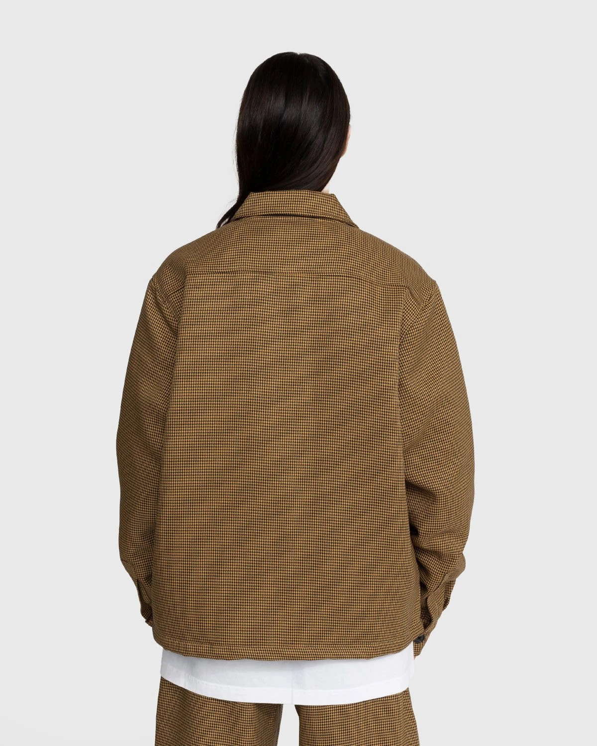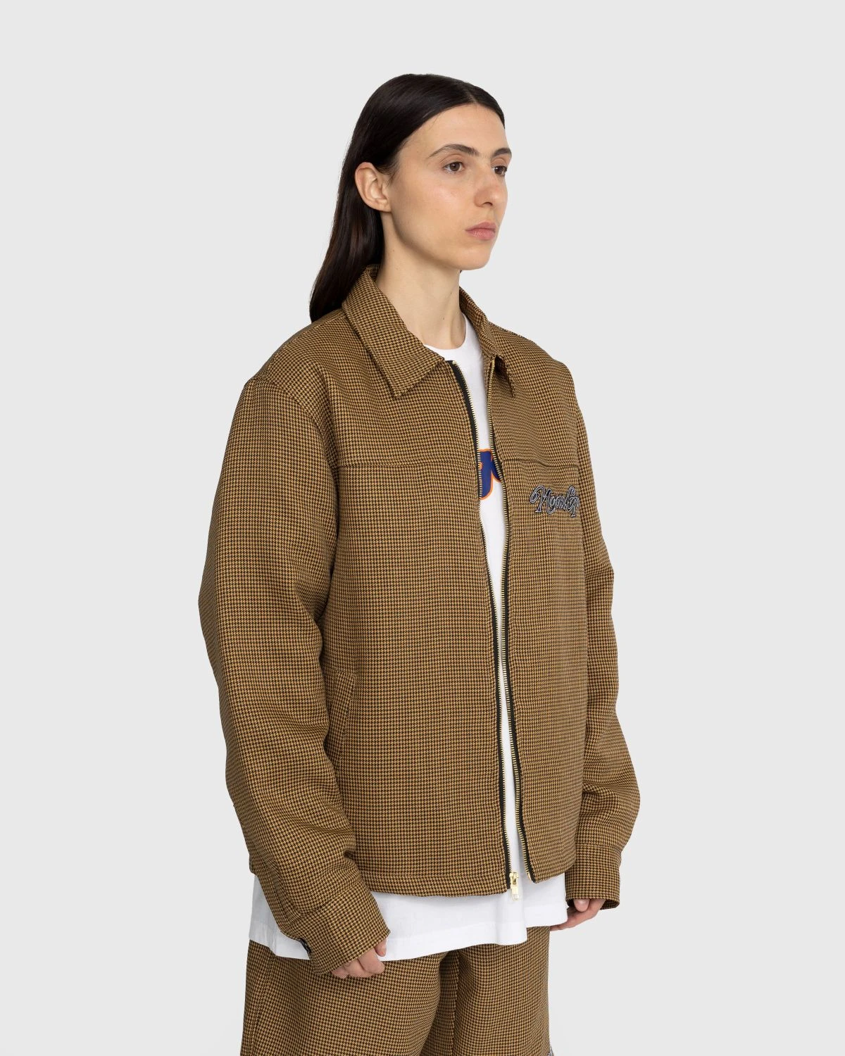 The Banned Houndstooth Jacket is a workwear-inspired style produced in 100% polyester on the outer, with quilted lining. In addition to showcasing a houndstooth pattern, the exterior of the garment is further embellished with Noon Goons logo embroidery at the chest. Other features include front zip closure and button cuffs that allow for minor adjustments, and single welt hand pockets as well as an interior patch pocket. The jacket is cut in a boxy fit that is true to size for a timeless look.