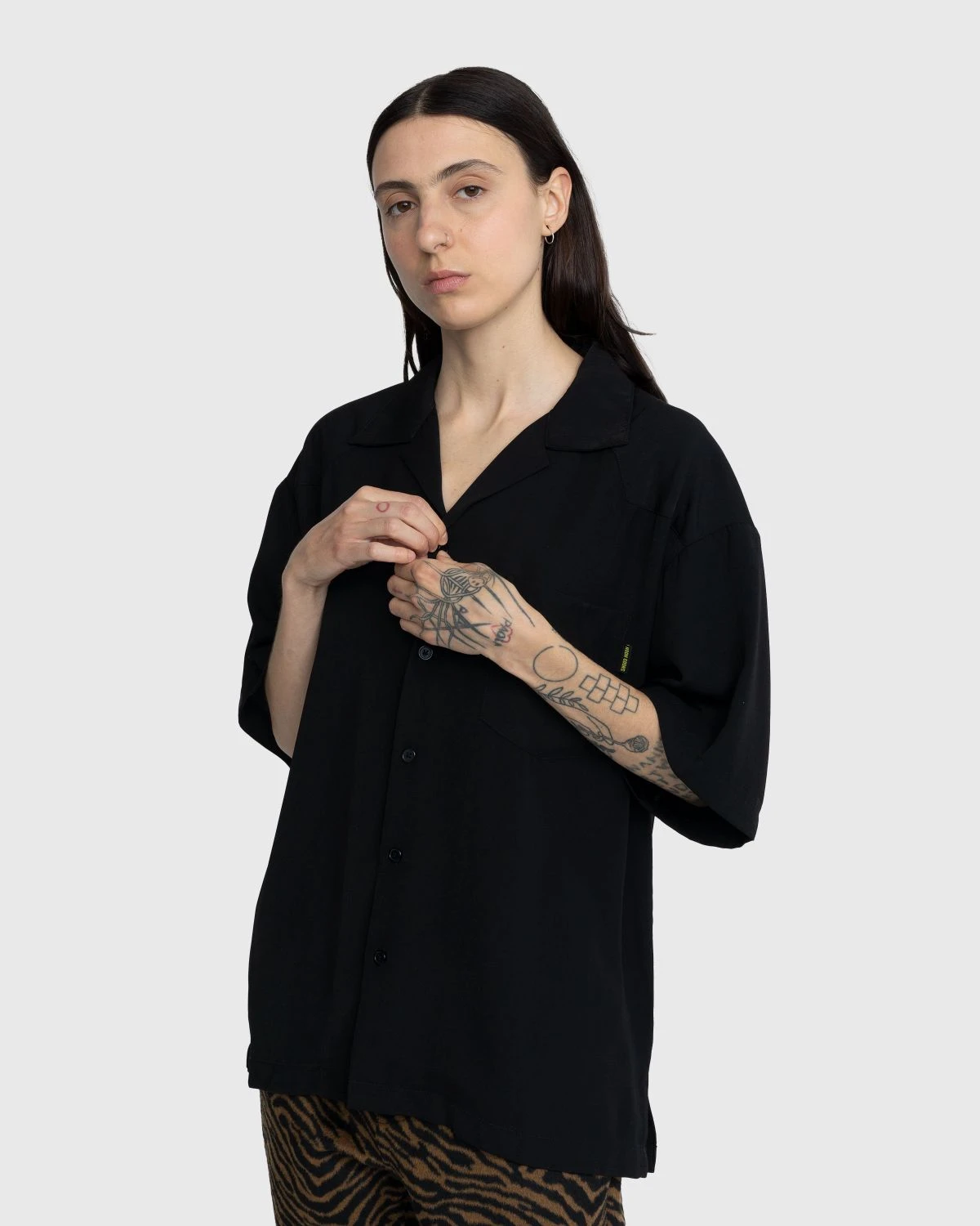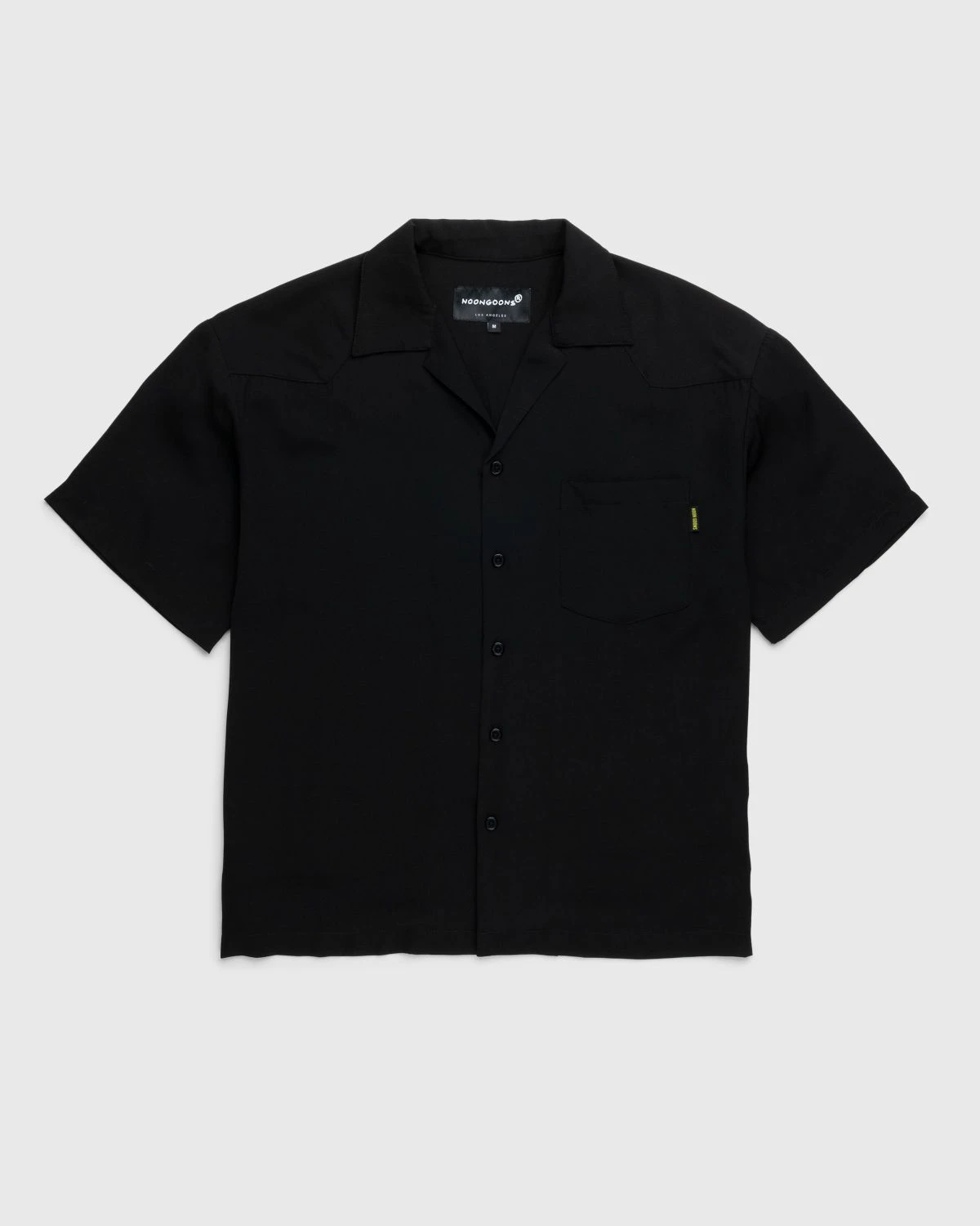 The Kickback Shirt is Noon Goons’ take on the classic camp collar shirt. Cut for a slightly oversized fit, the short-sleeve button-down features pointed detail at the front, in addition to back yokes, with a patch pocket incorporated at the chest. The garment arrives in a stealthy all-black colorway, subtly branded with a small woven label at the pocket.