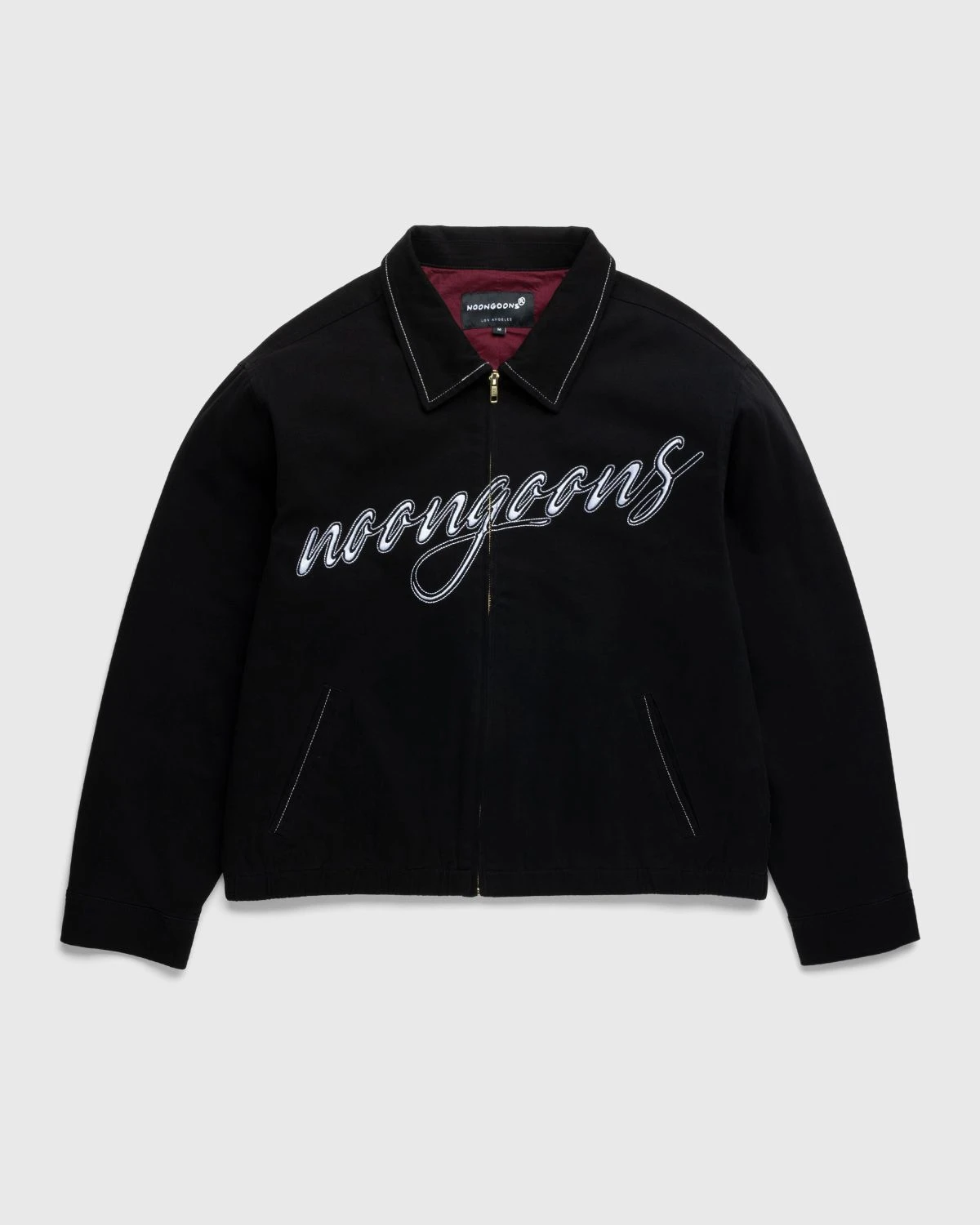 The Stitched Up Jacket is defined by contrasting stitching implemented at the collar and along the welt pockets. Constructed from cotton twill with contrasting cotton lining, the outerwear style features front zip closure and button cuffs that allow for minor adjustments, as well as a loose elastic waistband. Noon Goons’ script logo is incorporated onto the front of the piece in the form of intricate embroidery in a white shade.