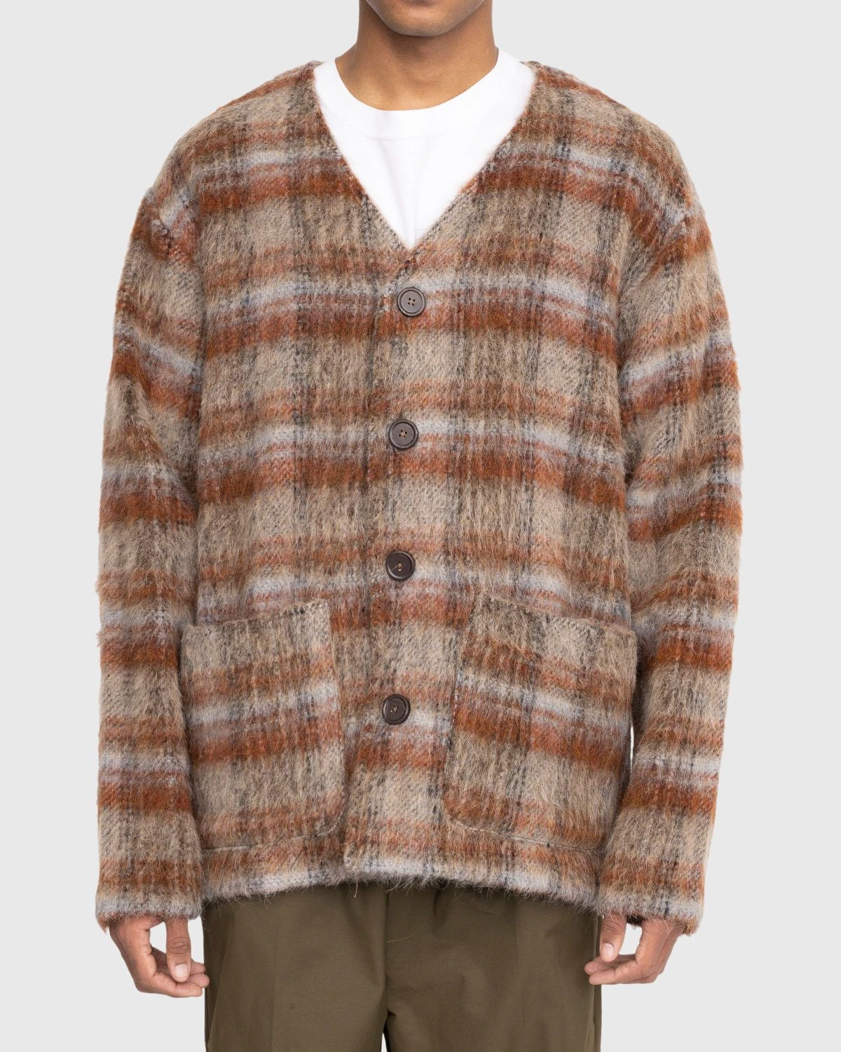Our Legacy’s Ament Check Mohair Cardigan is perfect for when you’re in the mood to wear something other than a light jacket. Made from a soft Italian wool blend fabric, the checked sweater is characterized by its hairy texture, featuring a V-neck collar as well as two front pockets for carrying small essentials. The cardigan offers a relaxed, oversized fit, allowing you to have fun with what you choose to wear underneath it.