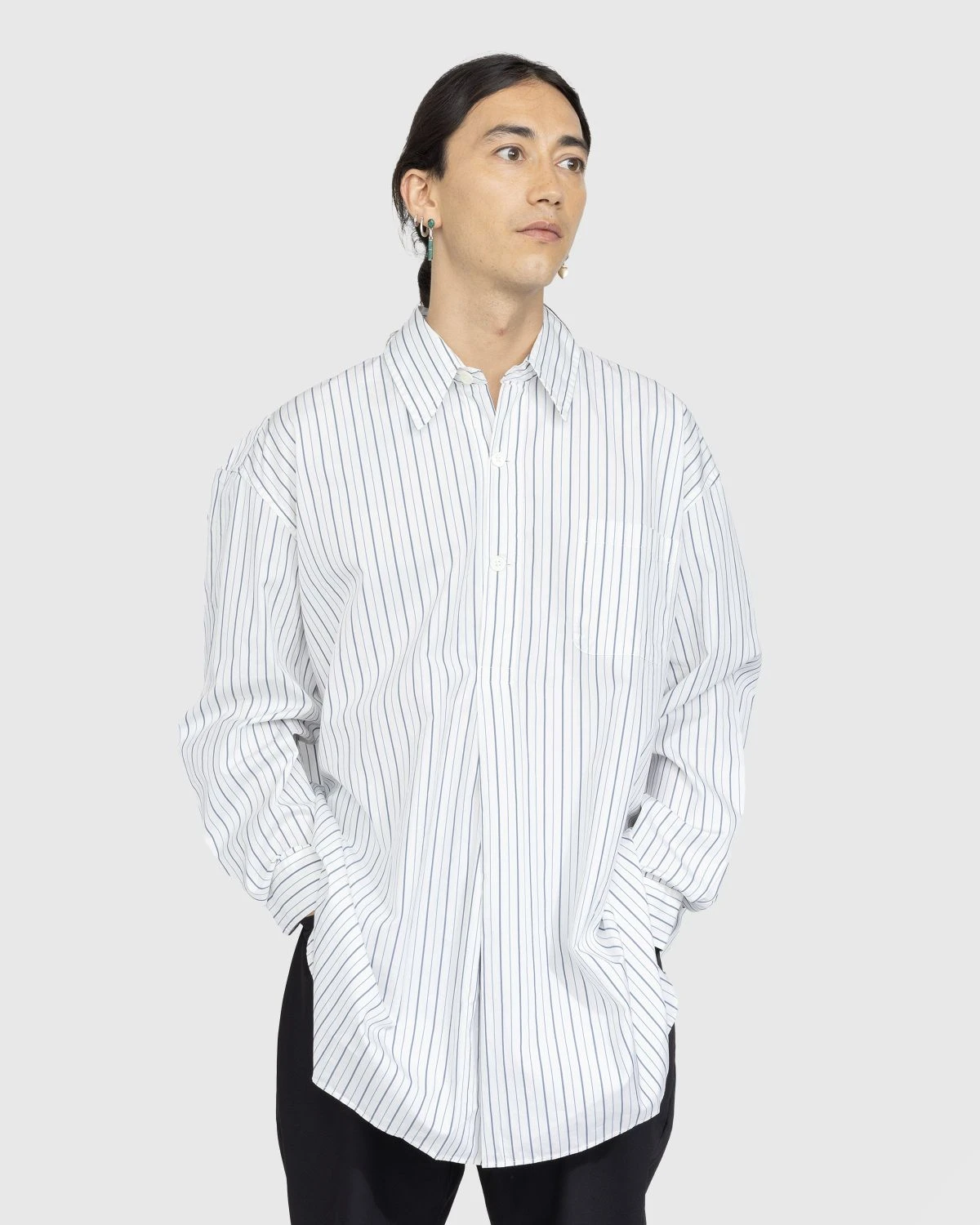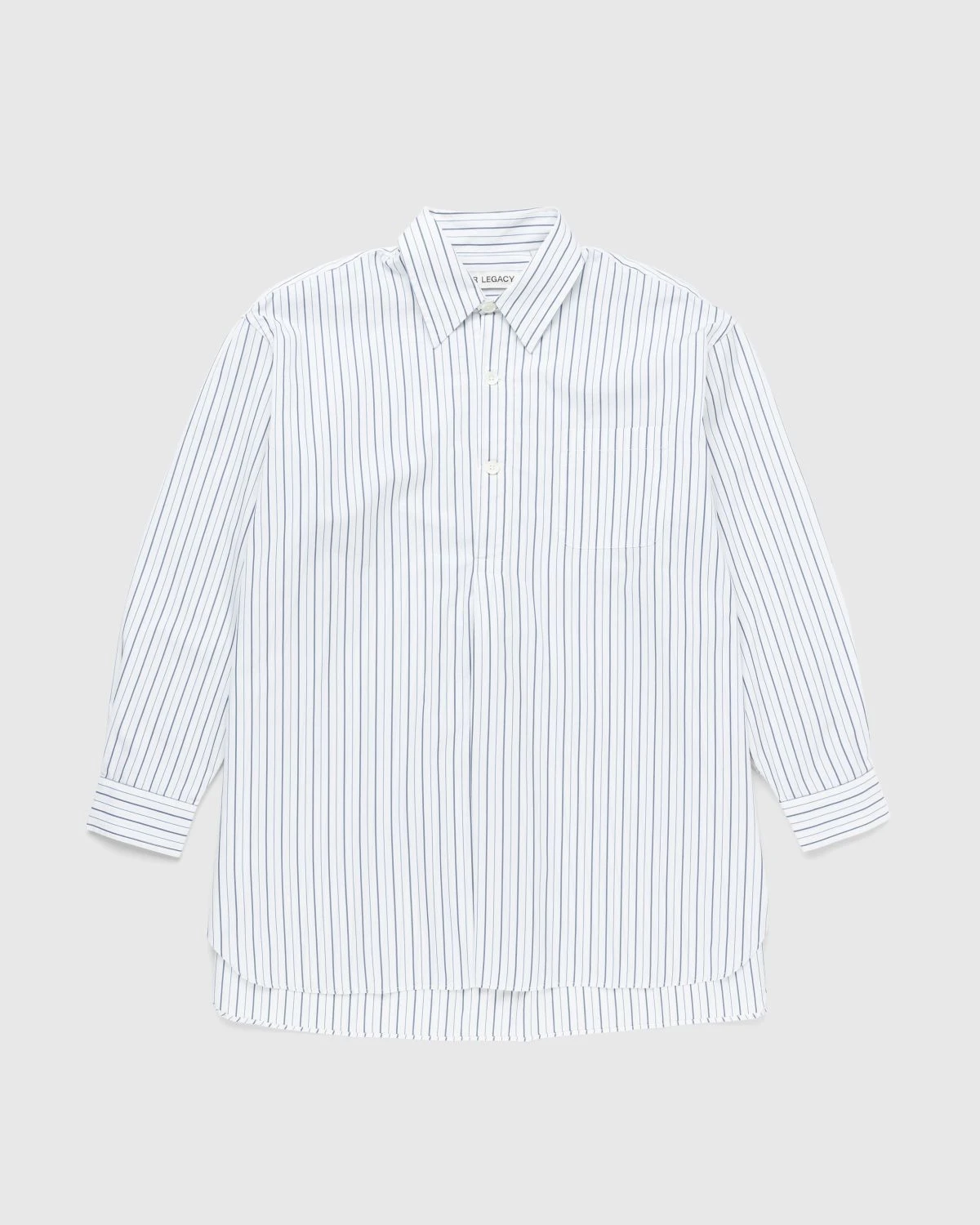 Our Legacy’s Popover Shirt is designed to fit considerably more relaxed than your traditional button-down. This particular version is made from 100% Portuguese cotton and showcases an all-over striped pattern. Details include mother of pearl buttons, high side vents, and a dropped tail, as a single pocket is incorporated at the left chest.