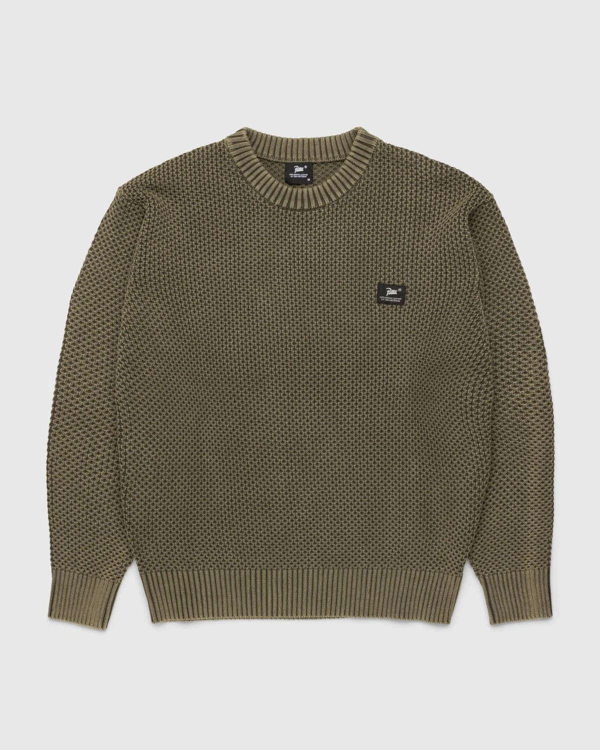 100% cotton. Cold dye wash. Honeycomb texture. 2×2 ribbings at the crew neck, cuffs, and hem. Patta woven patch at the left chest.