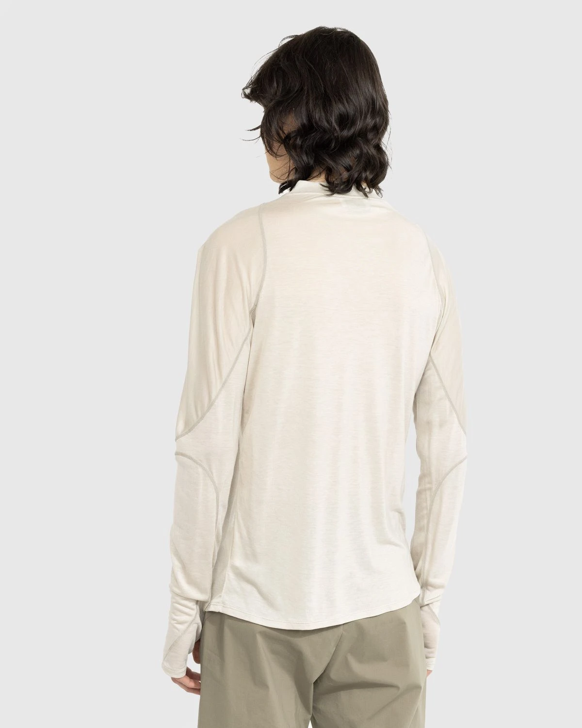 100% lyocell. Soft, lightweight fabric. Coverstitch line throughout. Mock neck. Thumbhole at the sleeves with bartack finish.
