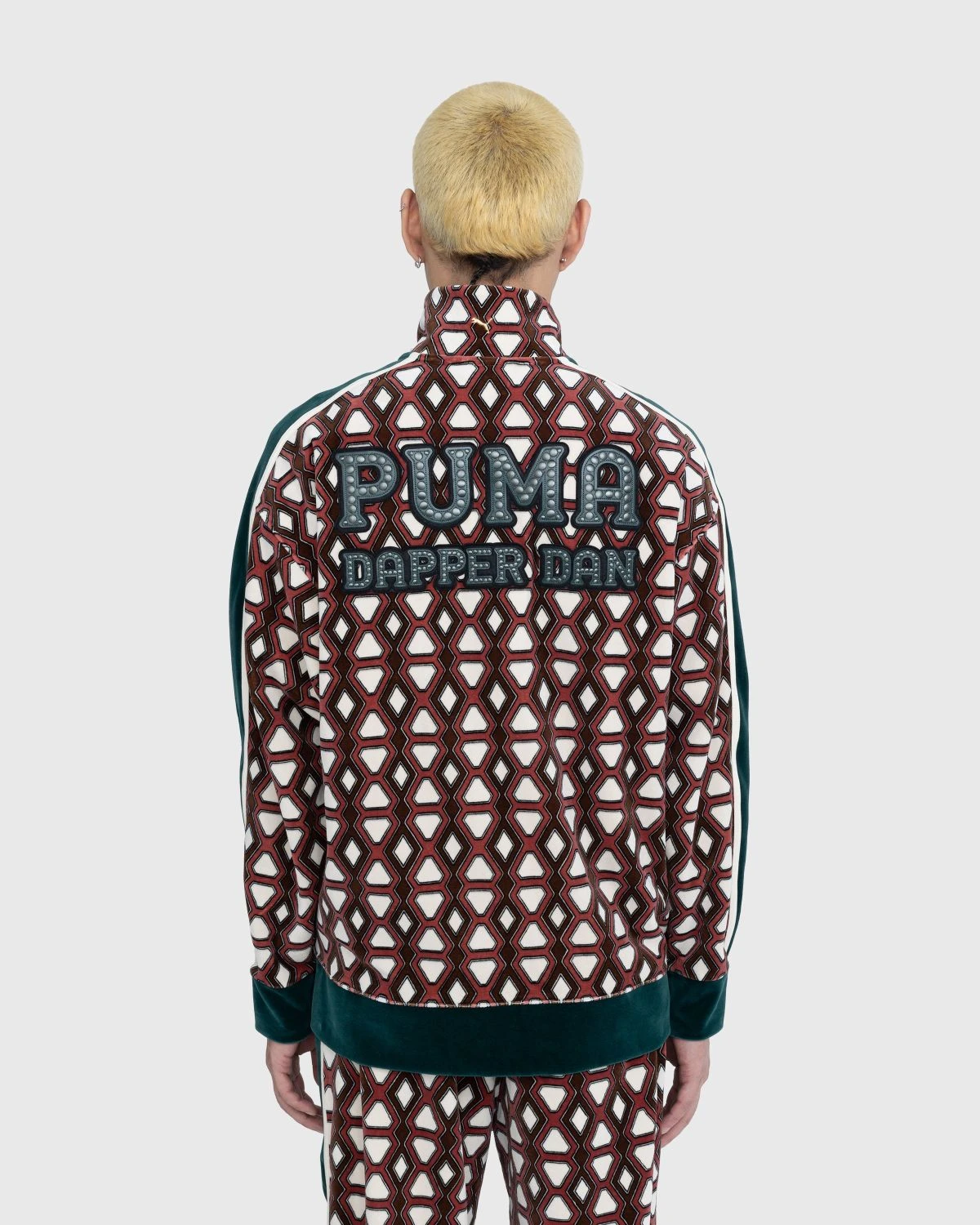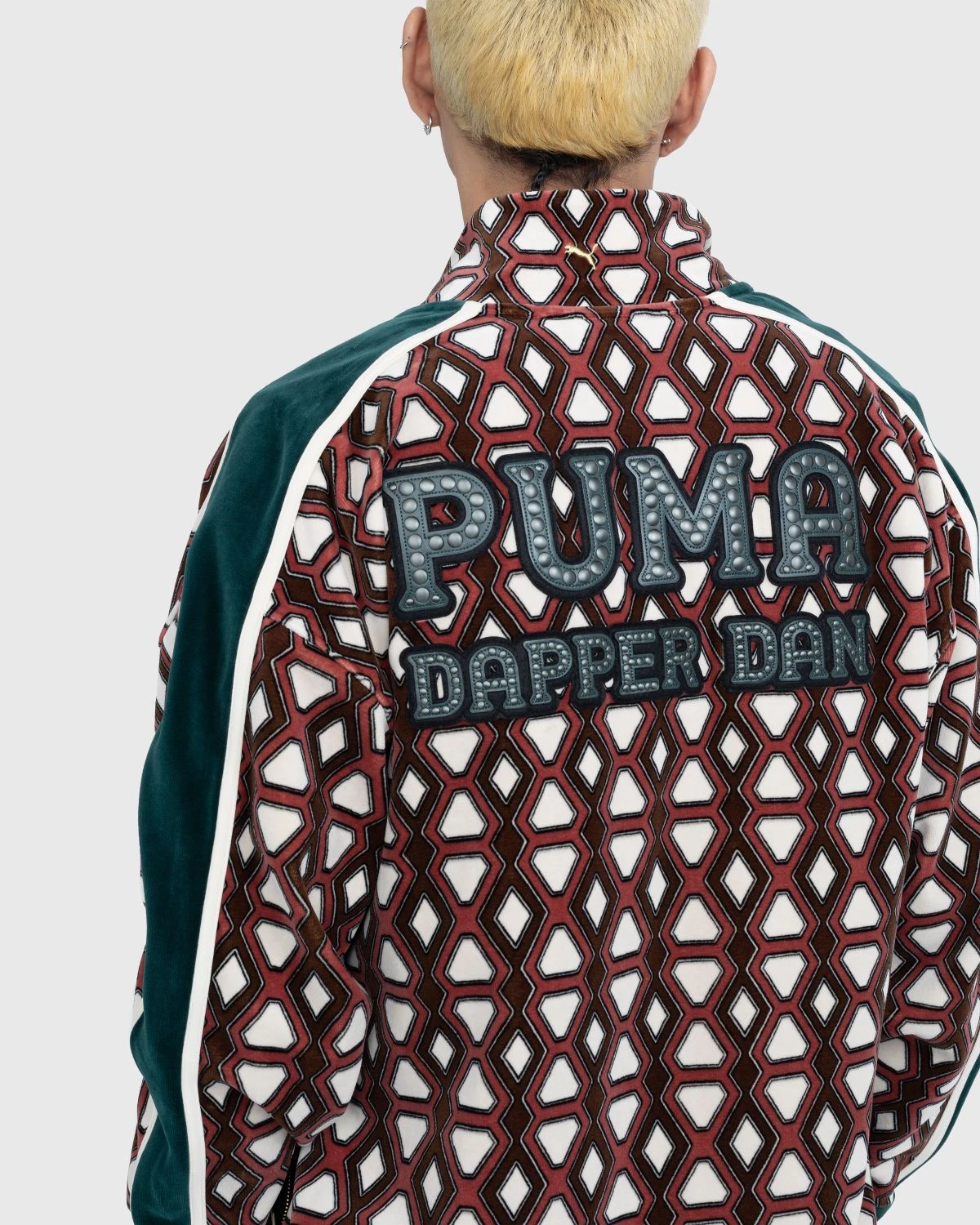 Dapper Dan draws inspiration from his Harlem roots for his second collaboration with Puma, while simultaneously pulling from the idea of a pre-game runway. Delivering a luxury upcycled aesthetic, the designer puts a distinctive spin on the classic T7 tracksuit, showcasing a captivating all-over pattern. The jacket is detailed with collaborative logo patches on the front as well as the back, as green trim and gold hardware provide a premium touch.