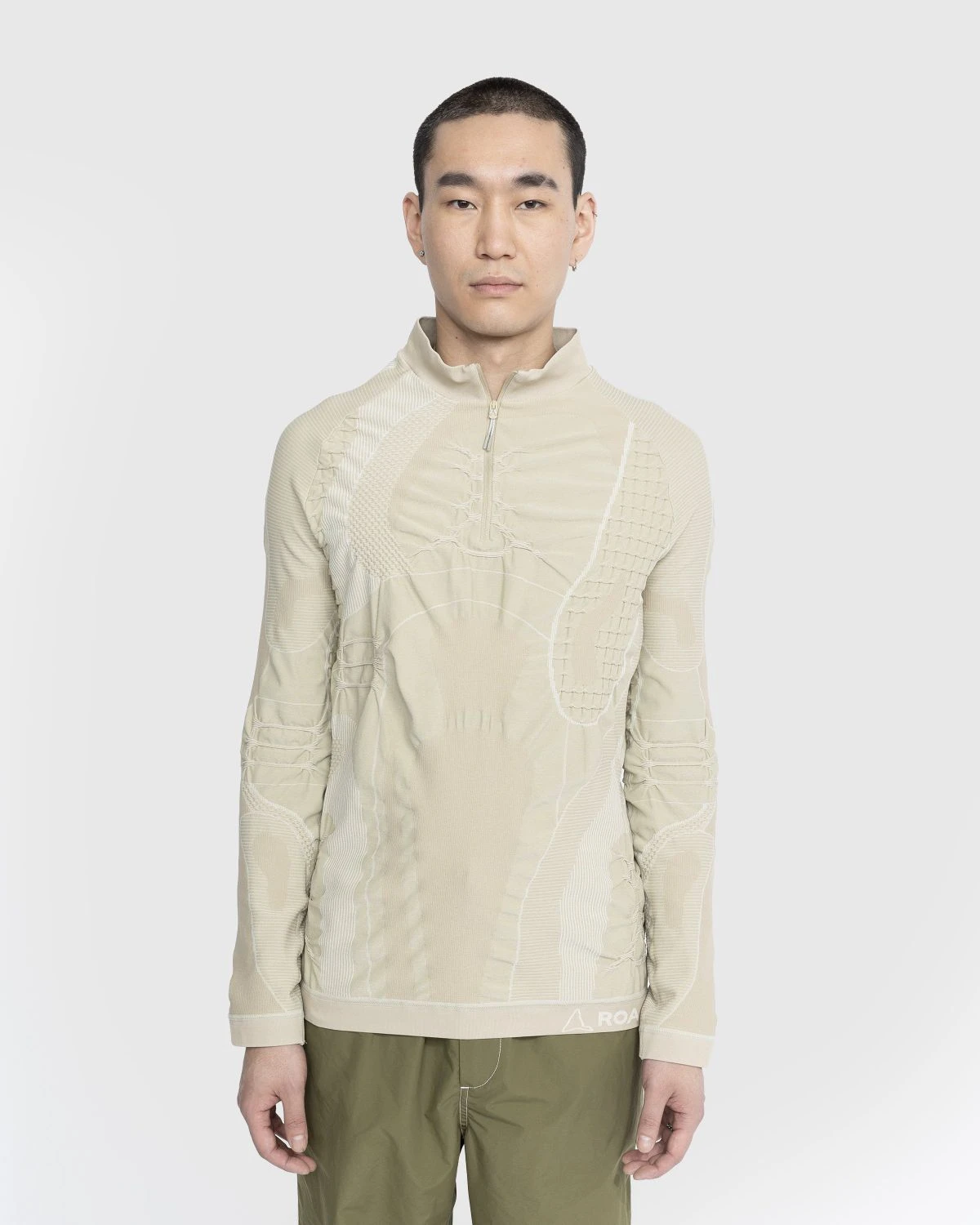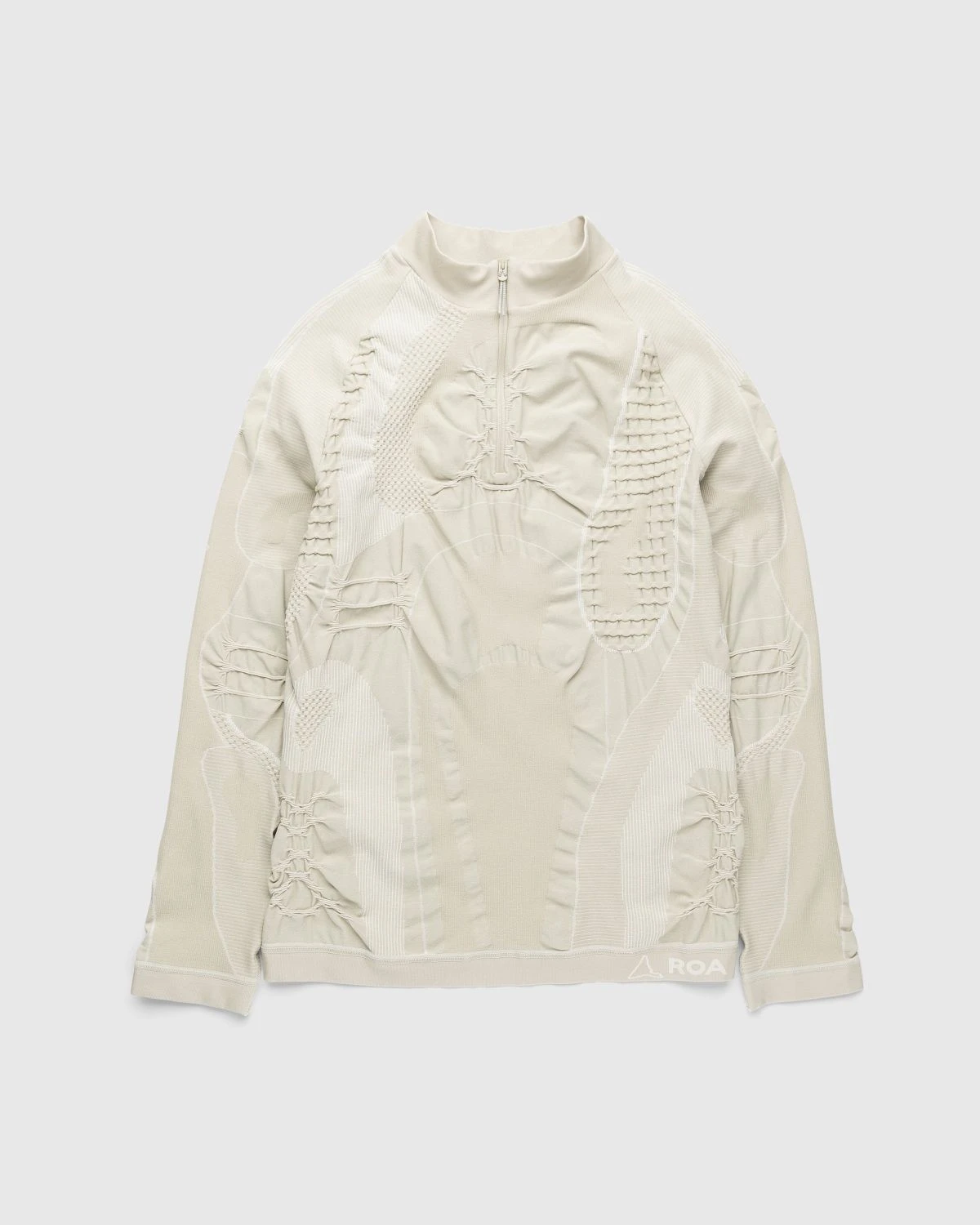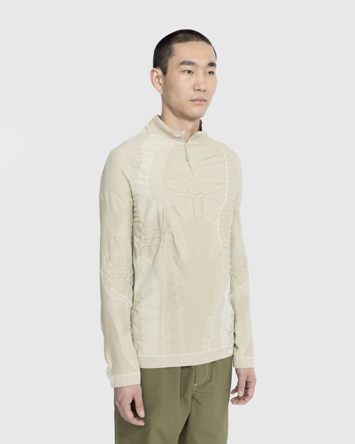 50% polypropylene. 50% nylon. Light insulating and breathable Dryarn fibers. Technical knit for layering. High collar. Half-length zip at the front. Raglan sleeves.
