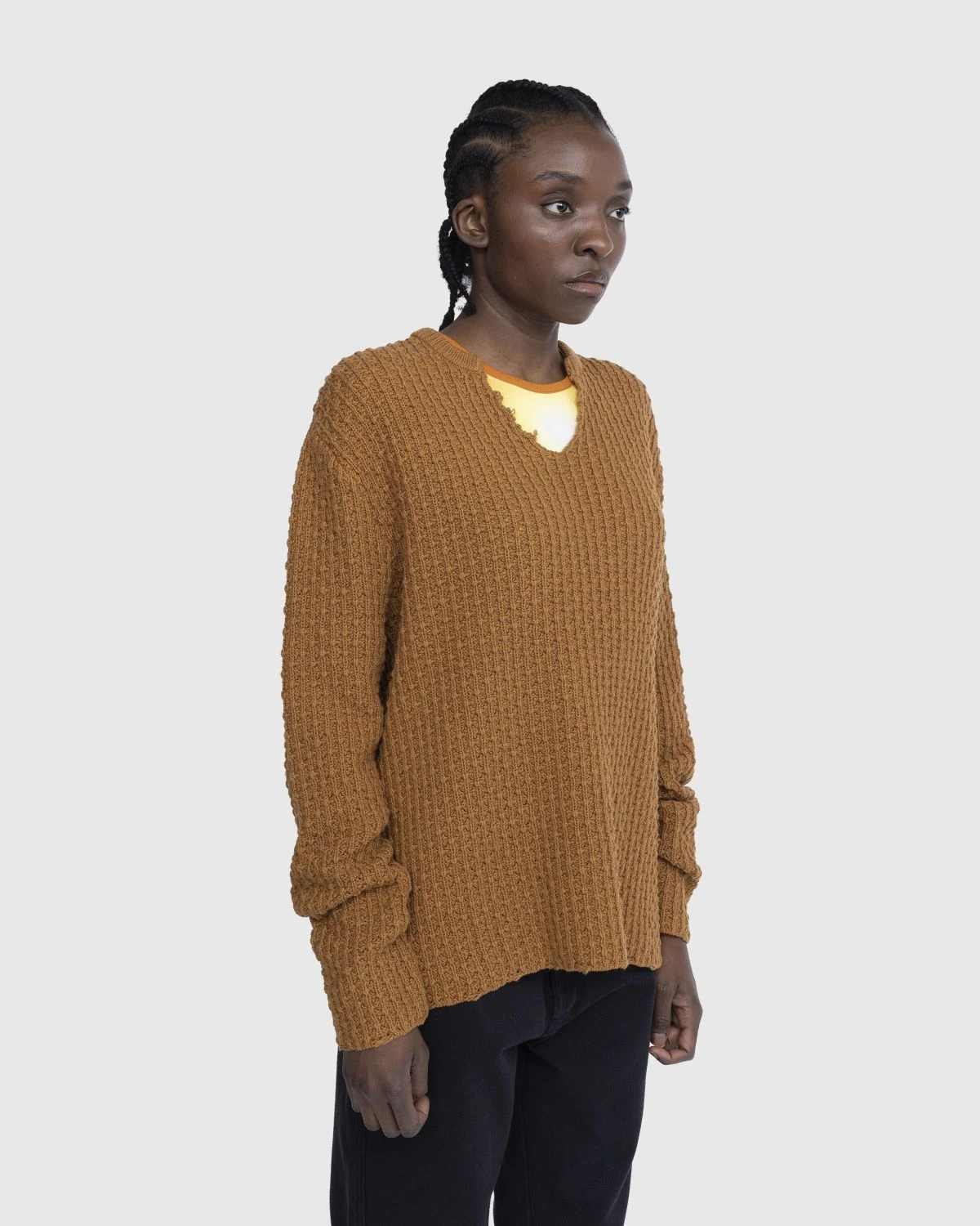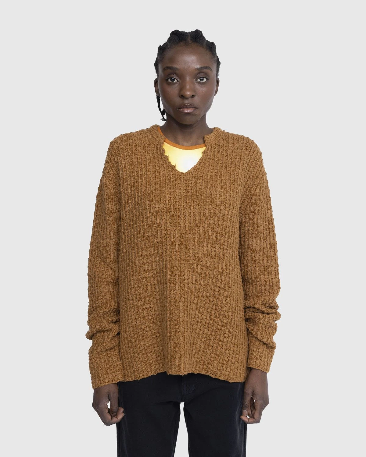 Stockholm Surfboard Club’s V-Neck Sweater is a considerably comfy style produced in a loose cotton tuck knit. Offered in a deep orange colorway, the multi-seasonal piece is defined by cut-up detailing at the collar, featuring an oversized fit for an extra cozy wear.