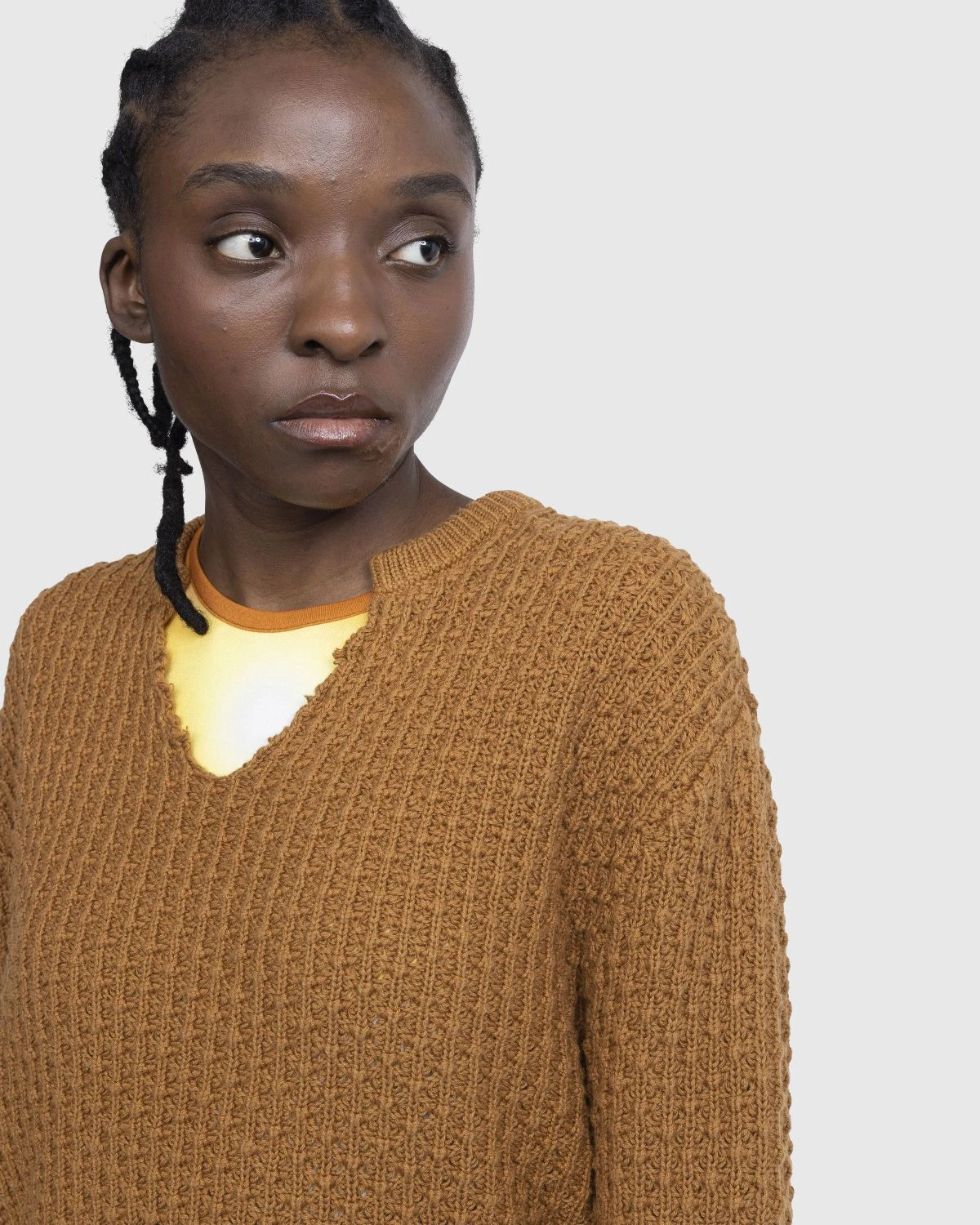 100% cotton. Loose cotton tuck knit. V-neck. Cut-up collar detail. Straight hem.