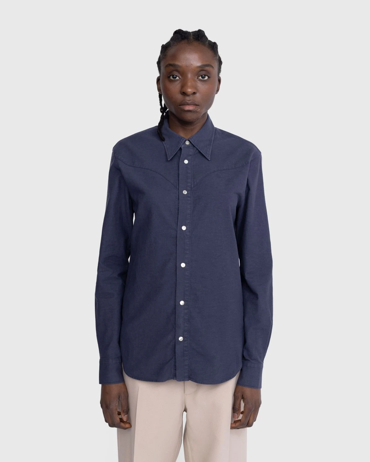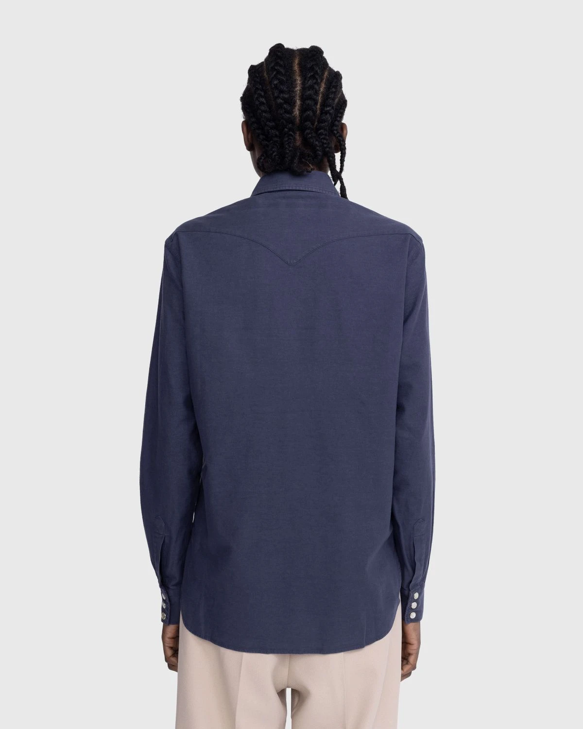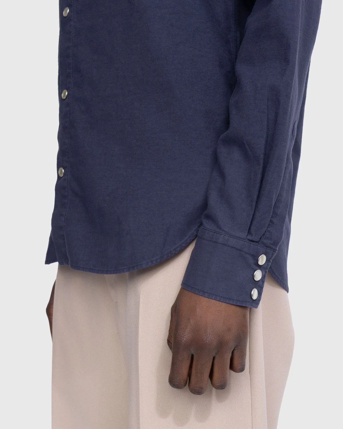 Drawing from traditional western styles, this Stockholm Surfboard Club button-up arrives in a neutral navy colorway that is slightly faded. It is crafted from 100% cotton and detailed with classic pearl snap buttons lined down the center front and at the sleeve cuffs.