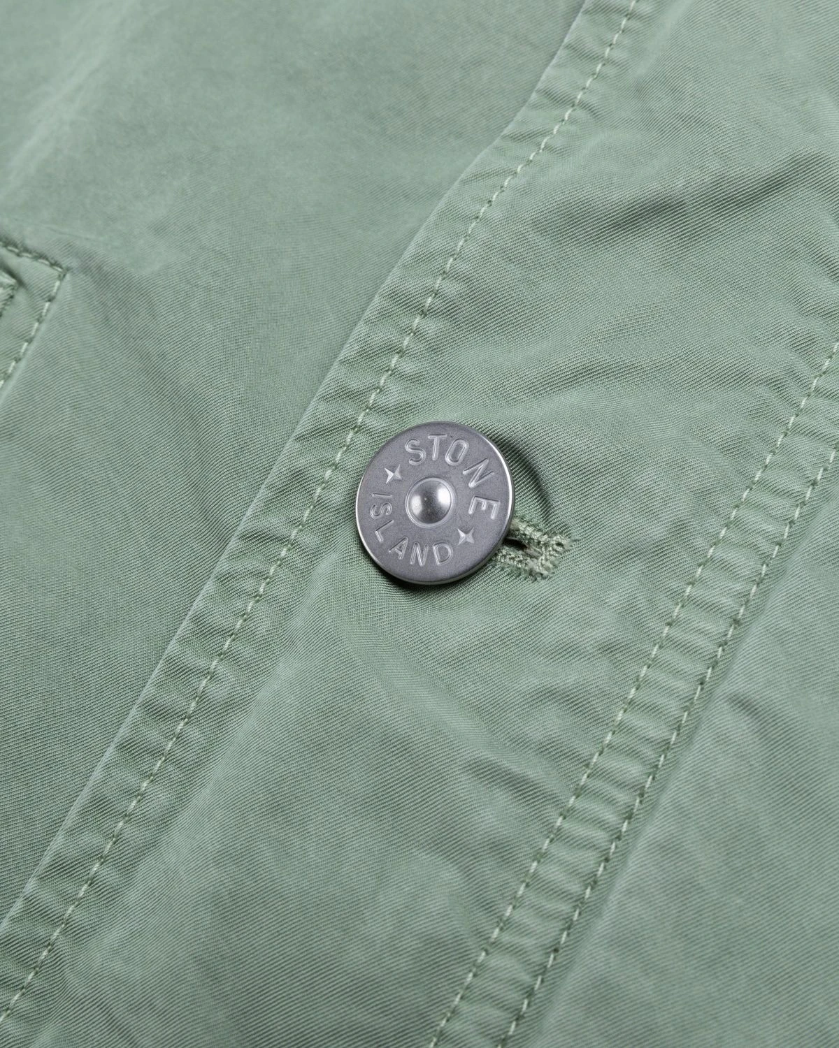 53% Cupro, 47% Cotton. Concealed hood in the collar; the drawstring on the hood is visible on the collar. One chest pocket with flap and hidden button on cotton loop fastening. Two patch hand pockets, with button fastening. Adjustable snaps at cuffs. Hidden two-way zipper and button fastening. Wind-resistant. Stone Island badge on the left sleeve.