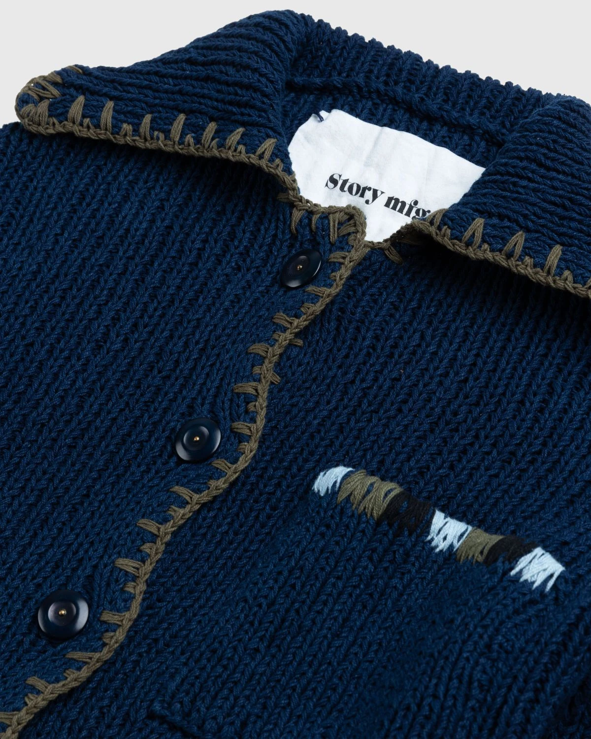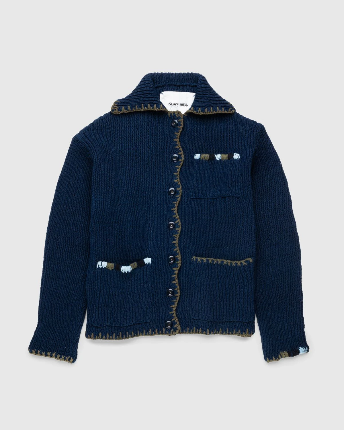 Like many Story mfg. garments, the Grandad Cardigan is rib hand knitted using 100% organic cotton which has been naturally dyed. It is detailed with stitched and crochet edging, while featuring an oversized collar and a trio of pockets on the front of the sweater. Corozo nut buttons line down the center of the silhouette, which is cut for a drapey fit that hangs loosely off the shoulders. Due to the hand knitting, the cardigan will grow with wear.