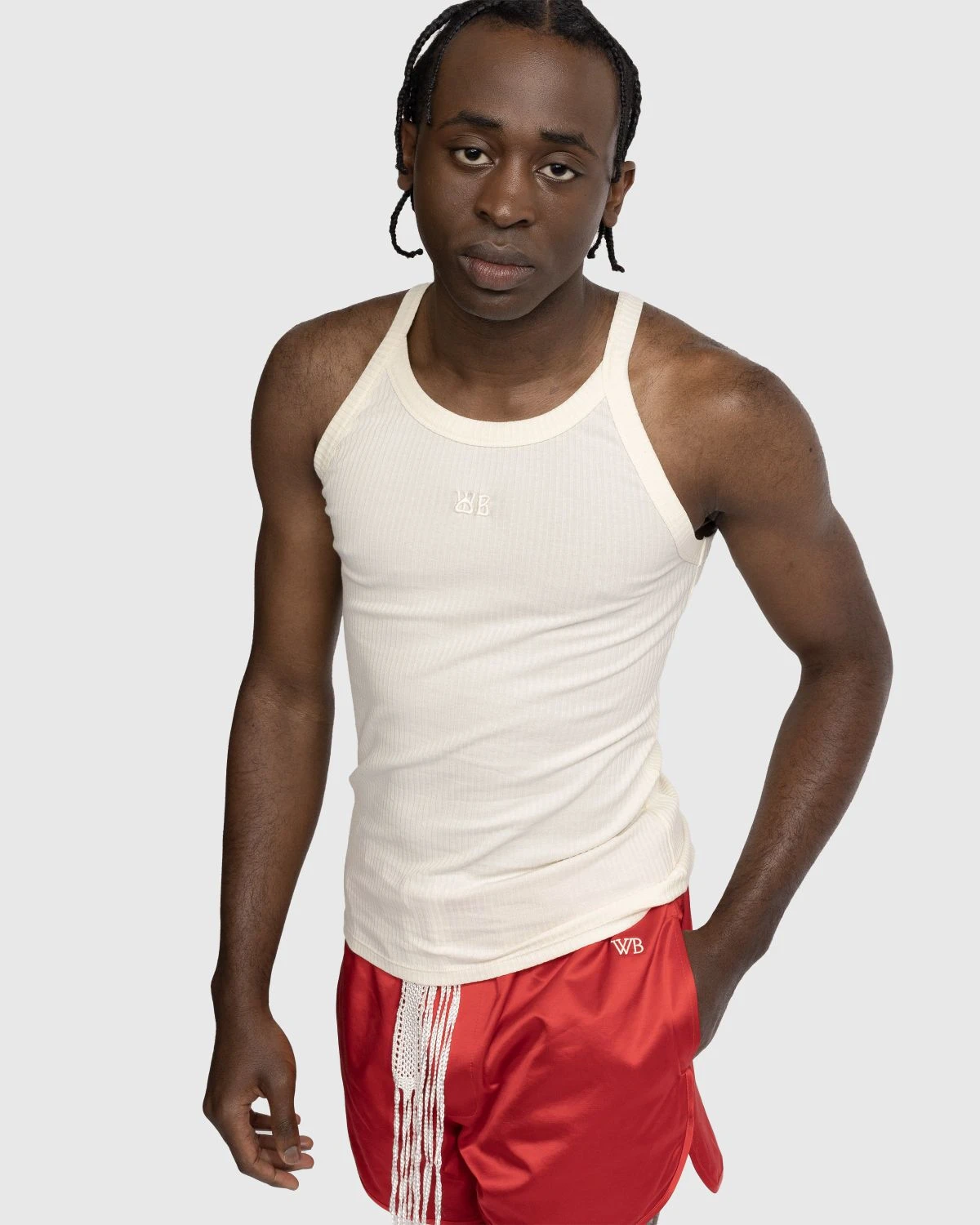 Wales Bonner updates archival leisurewear with the Groove Tank, offered here in the brand’s signature ivory shade. The slim-fitting style is predominantly made from organic cotton and subtly embellished with a small logo implemented at the chest.