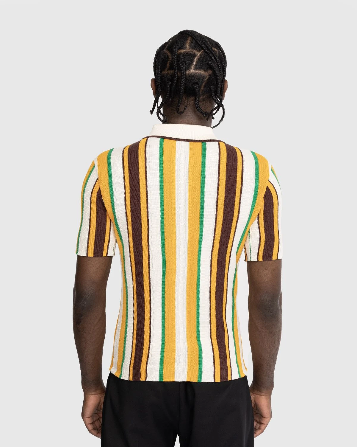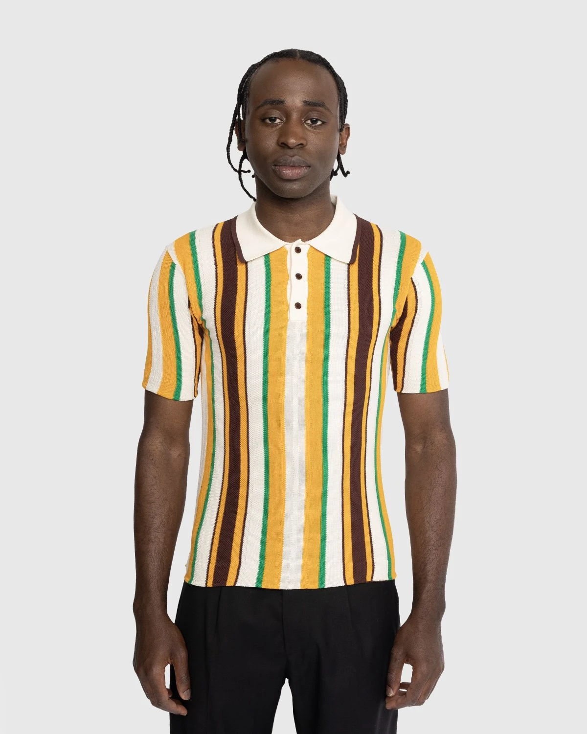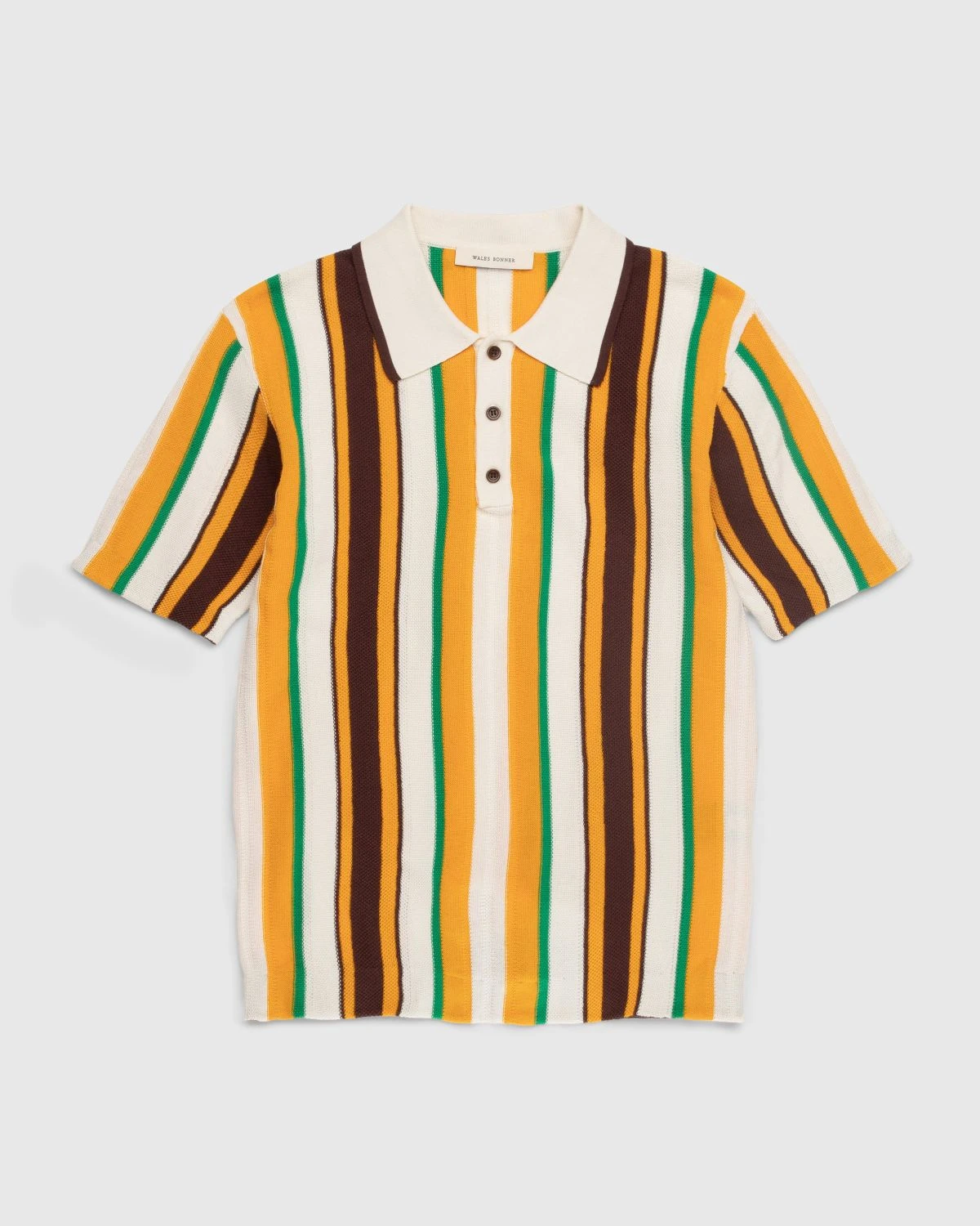 The Optimist Polo is a signature Wales Bonner style produced in 100% cotton. Offering a cropped fit, the short-sleeve shirt is brought to life with textured stripes in vibrant tones. Details include a classic polo collar and three-button closure.