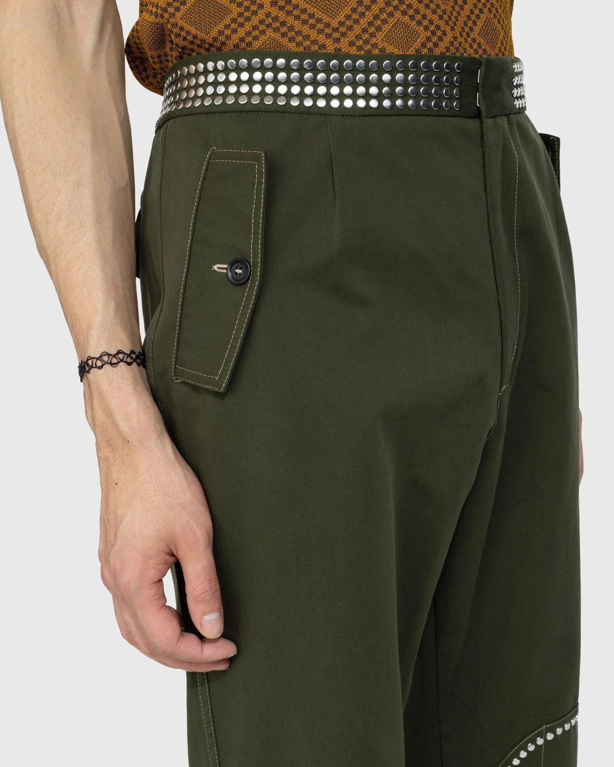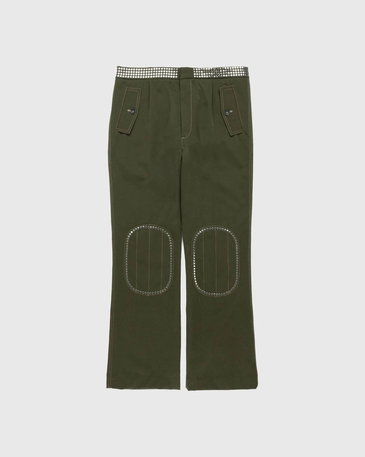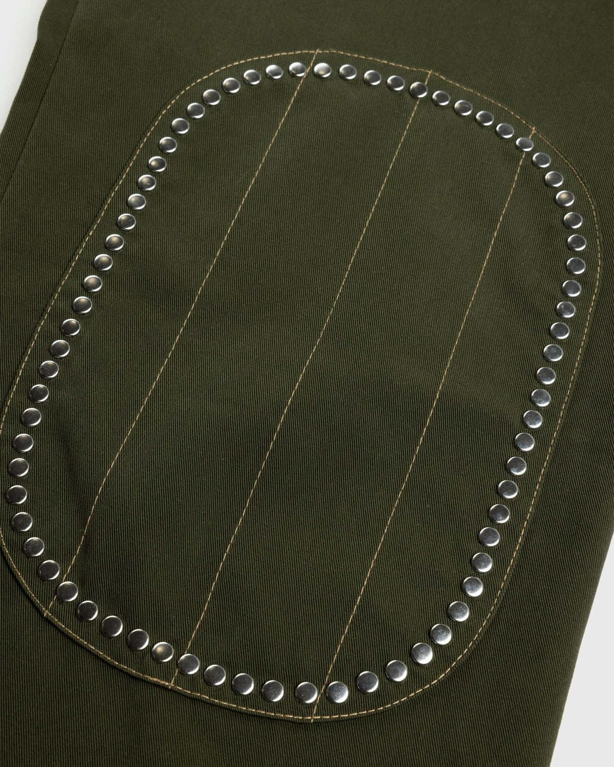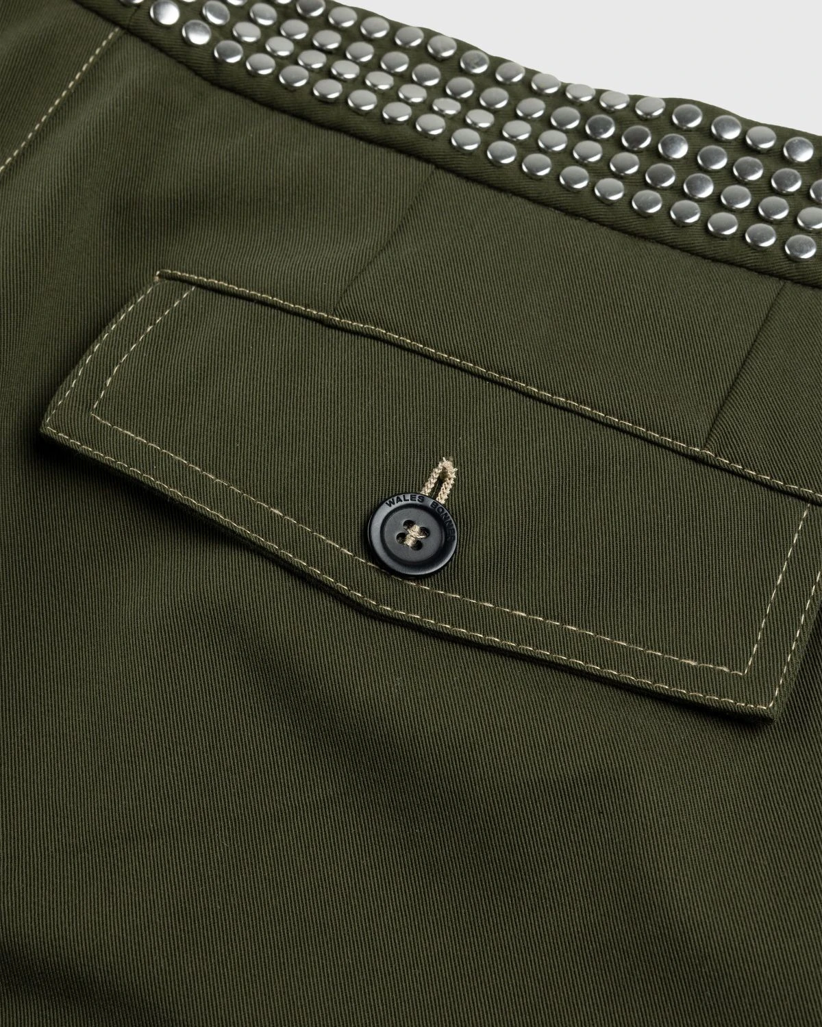 Wales Bonner’s Tomorrow Trousers draw immediate attention with studded ornamentation applied to the waistband and around the knee patches. The pair is cut for a straight fit and slightly cropped in length, made from 100% cotton drill. Pockets are incorporated at the sides and back by way of buttoned flap pockets for added security.